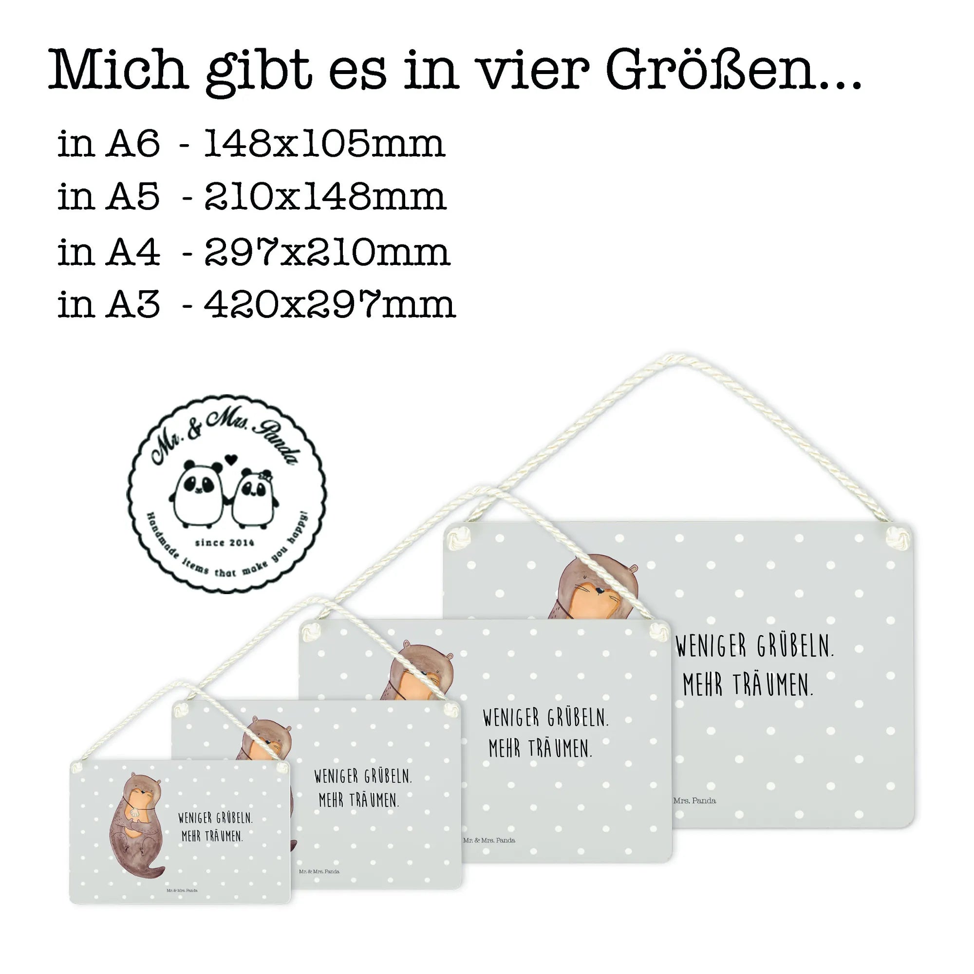 Mit diesem Deko Schild hast du die Möglichkeit, deine Wände kreativ zu gestalten und deine Freunde mit einer besonderen Überraschung zu erfreuen. Das Motiv ist handgezeichnet und wird edel bedruckt, sodass es jede Wand zum Strahlen bringt. Es bringt eine motivierende Botschaft in dein Büro oder deinen Wohnraum: 'Weniger grübeln, mehr träumen.' Also lass dich inspirieren von diesem charmanten Otter und mache dir oder deinen Liebsten eine Freude.