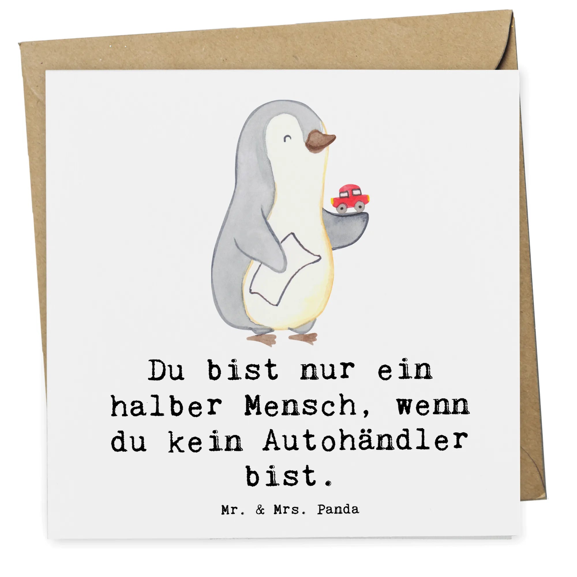 Mit dem Slogan "Du bist nur ein halber Mensch, wenn du kein Autohändler bist" wird die Bedeutung des Autobusiness leicht humorvoll und herzlich in den Vordergrund gerückt. Diese Karte aus der Berufe Kollektion von Mr. & Mrs. Panda bietet eine kreative Möglichkeit, Danke zu sagen, sei es zum Abschied, zur Rente oder einfach nur, um einem guten Kollegen ein Lächeln ins Gesicht zu zaubern.