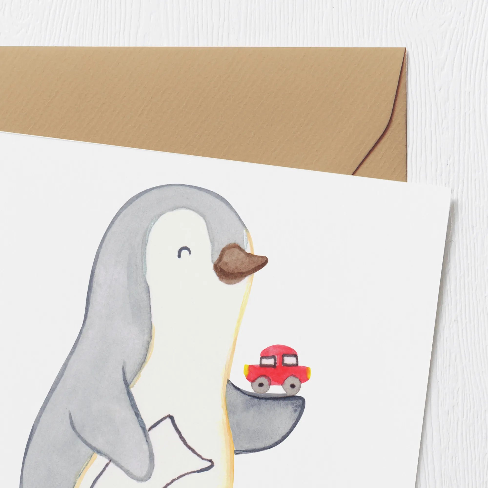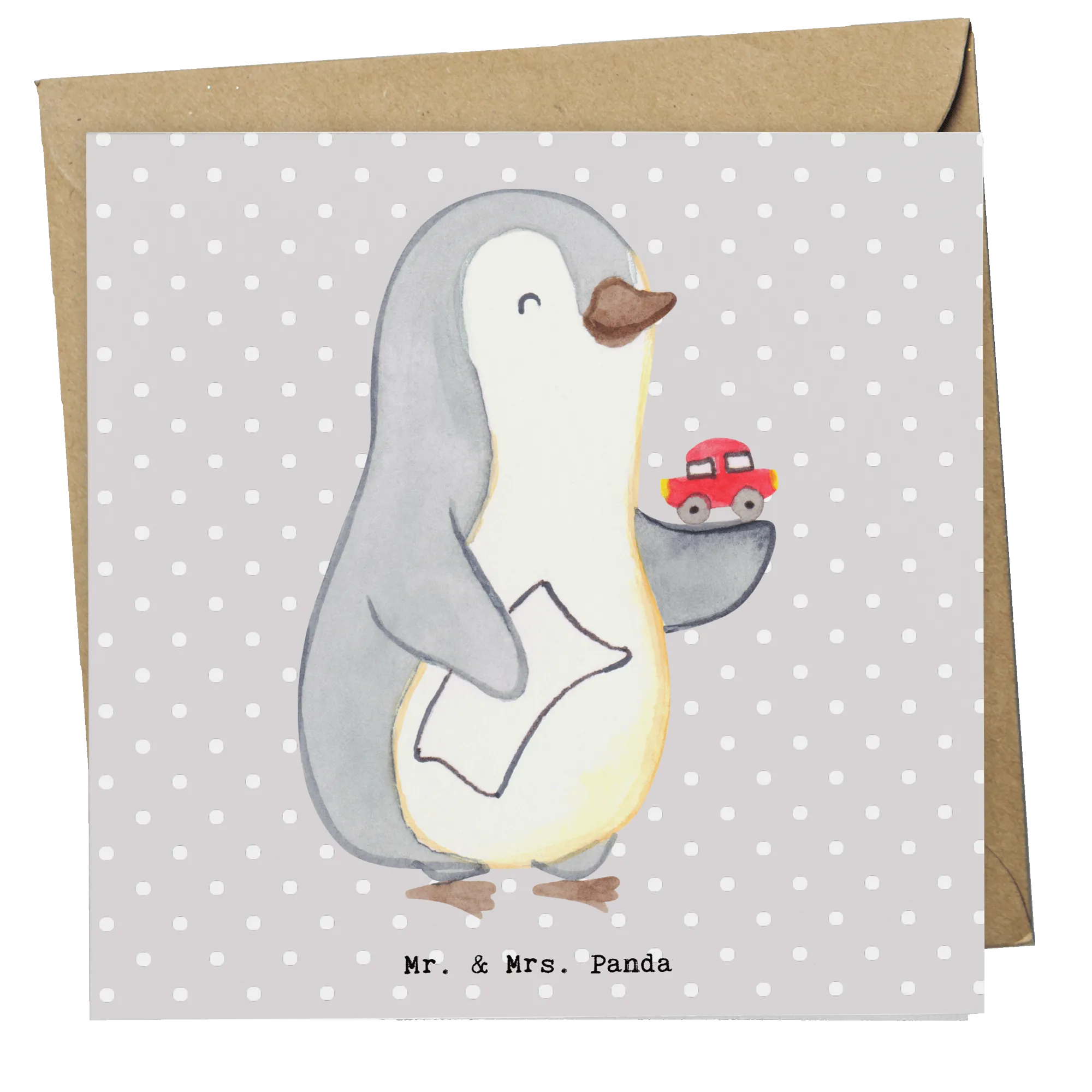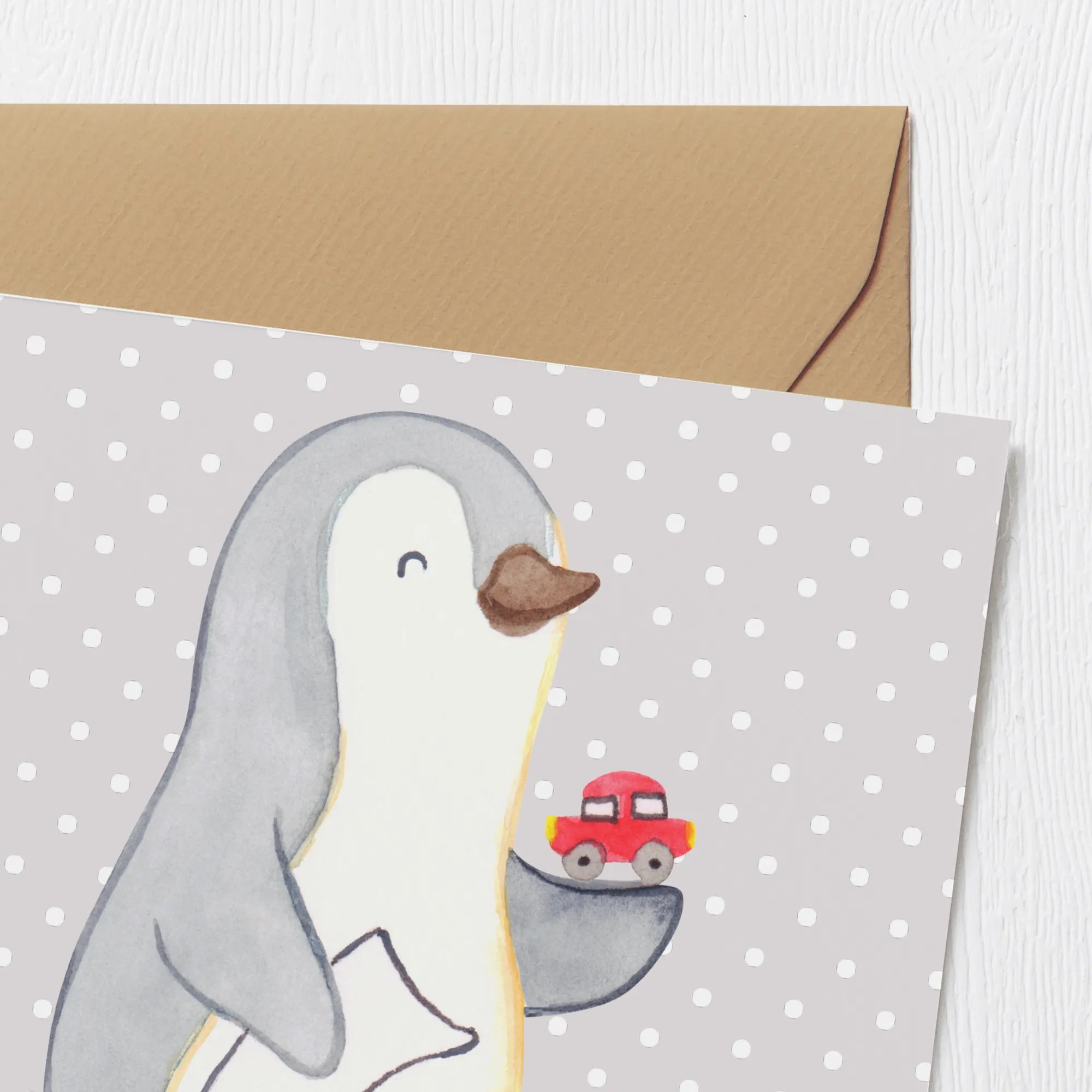 Die hochwertige Klappkarte hat die Maße 140 mm x 140 mm und besteht aus edlem 300 Gramm Karton, der eine sehr edel und einzigartige Optik bietet. Mit einem süßen Pinguin-Motiv, der einen Spielzeug-Auto in der Hand hält und persönlichen Botschaften auf der blanko Innenseite, eignet sich die Karte ideal für verschiedene Anlässe wie Geburtstage, Hochzeiten, Jubiläen oder als kleine Aufmerksamkeit zum Berufsabschied.