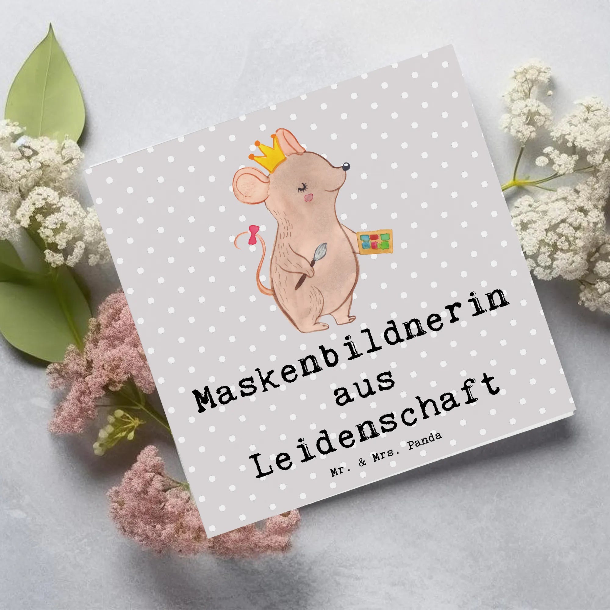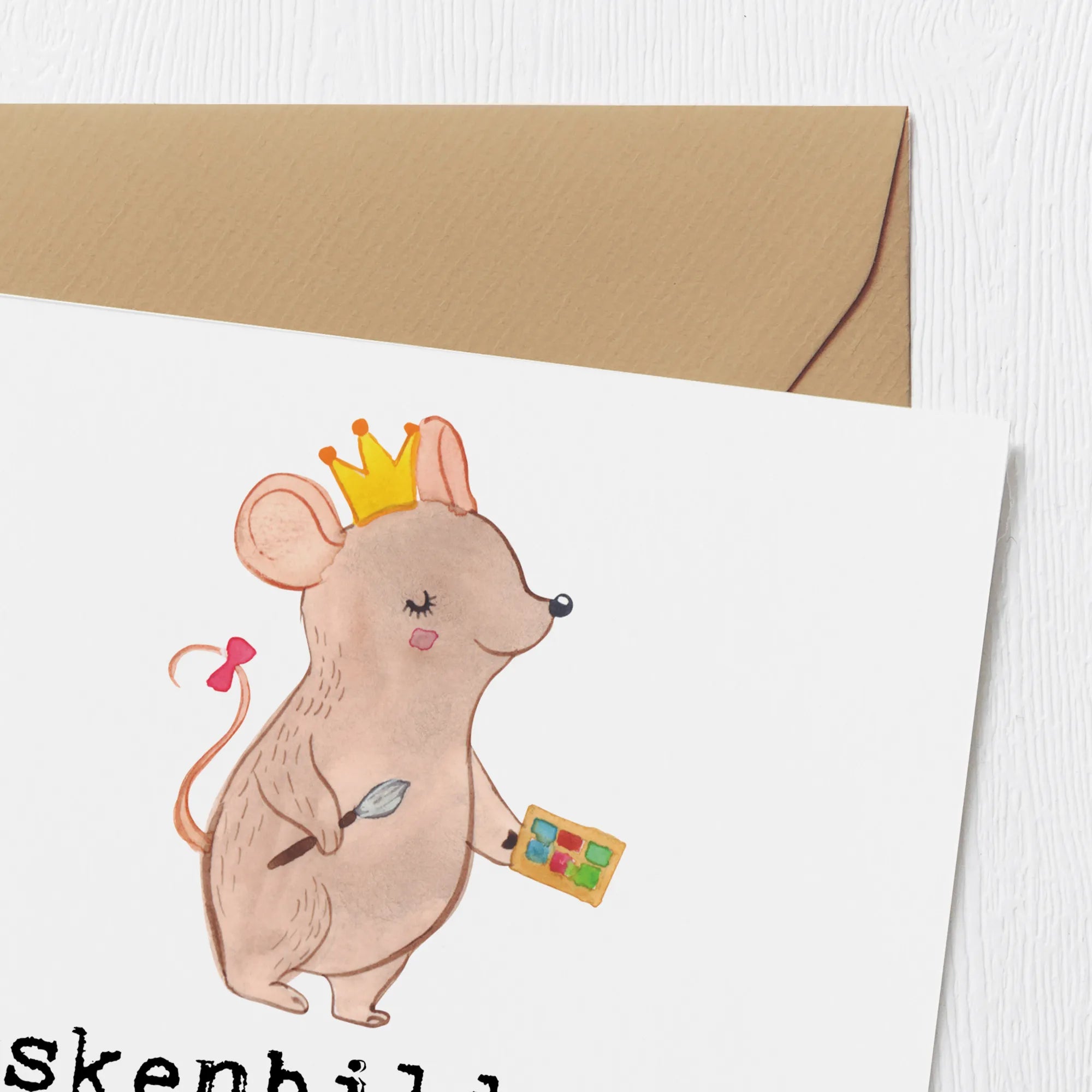 Die Karte ist 140 mm x 140 mm groß und aus hochwertigem Karton gefertigt, der eine matte Innenseite bietet, damit du deine persönlichen Glückwünsche wunderbar eintragen kannst. Auf der Vorderseite prangt das süße Motiv, das eine charmante Maus mit Krone und Schminkpinsel darstellt, umgeben von dem inspirierenden Slogan 'Maskenbildnerin aus Leidenschaft'.