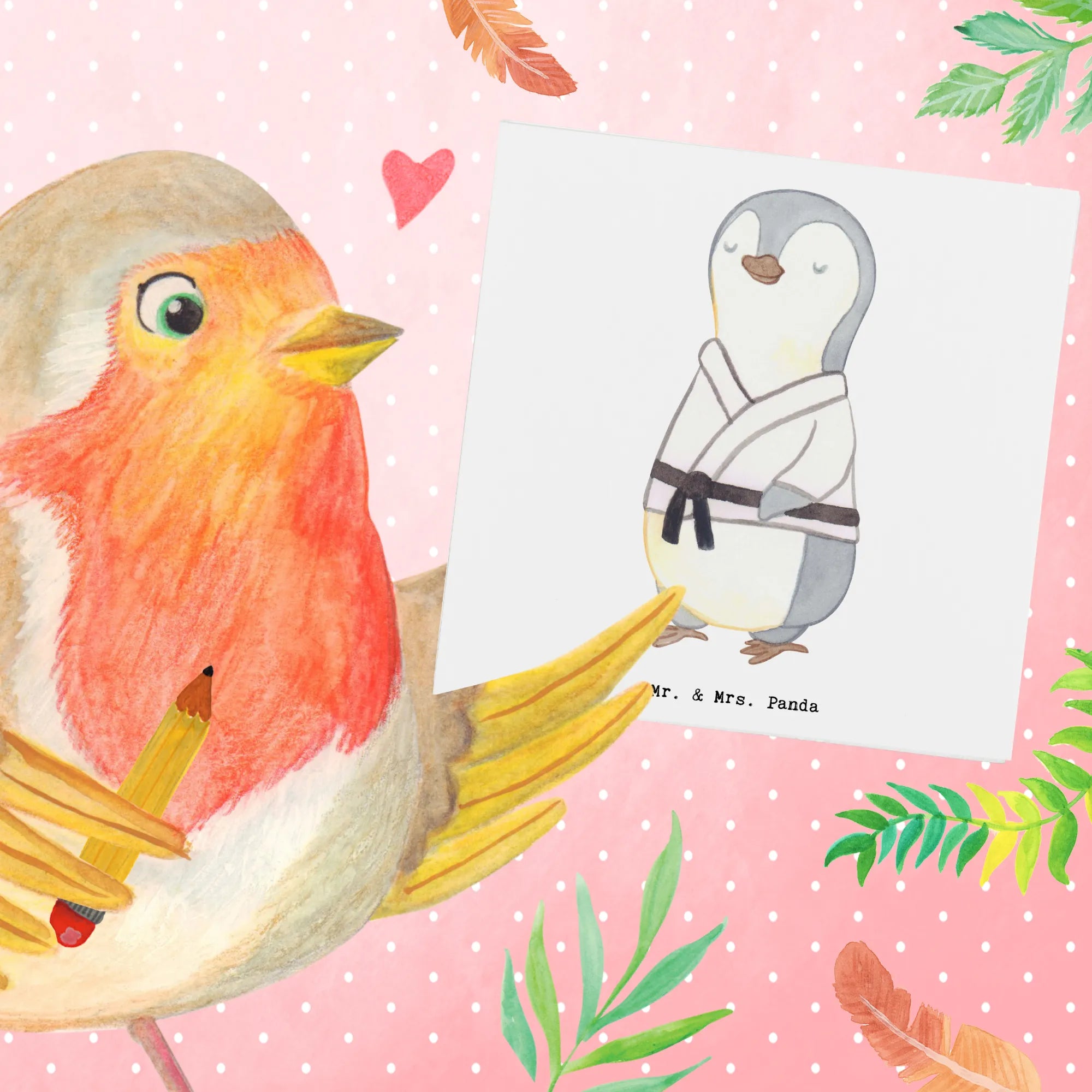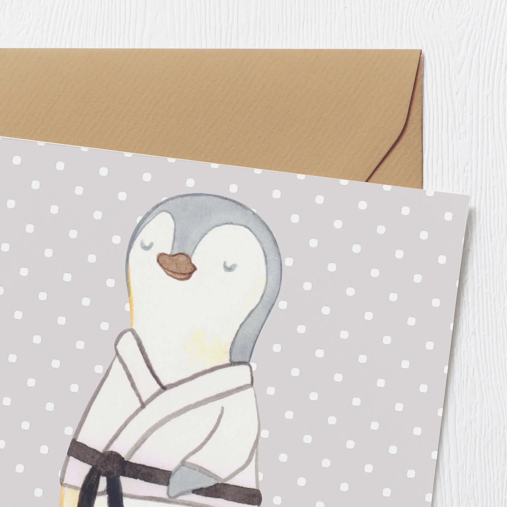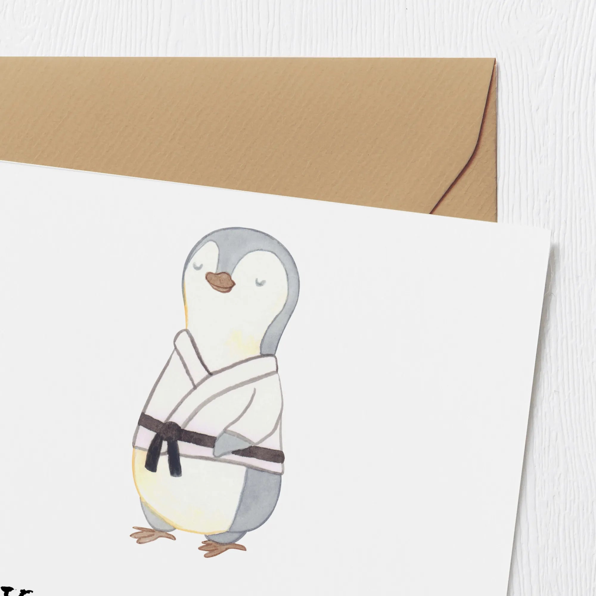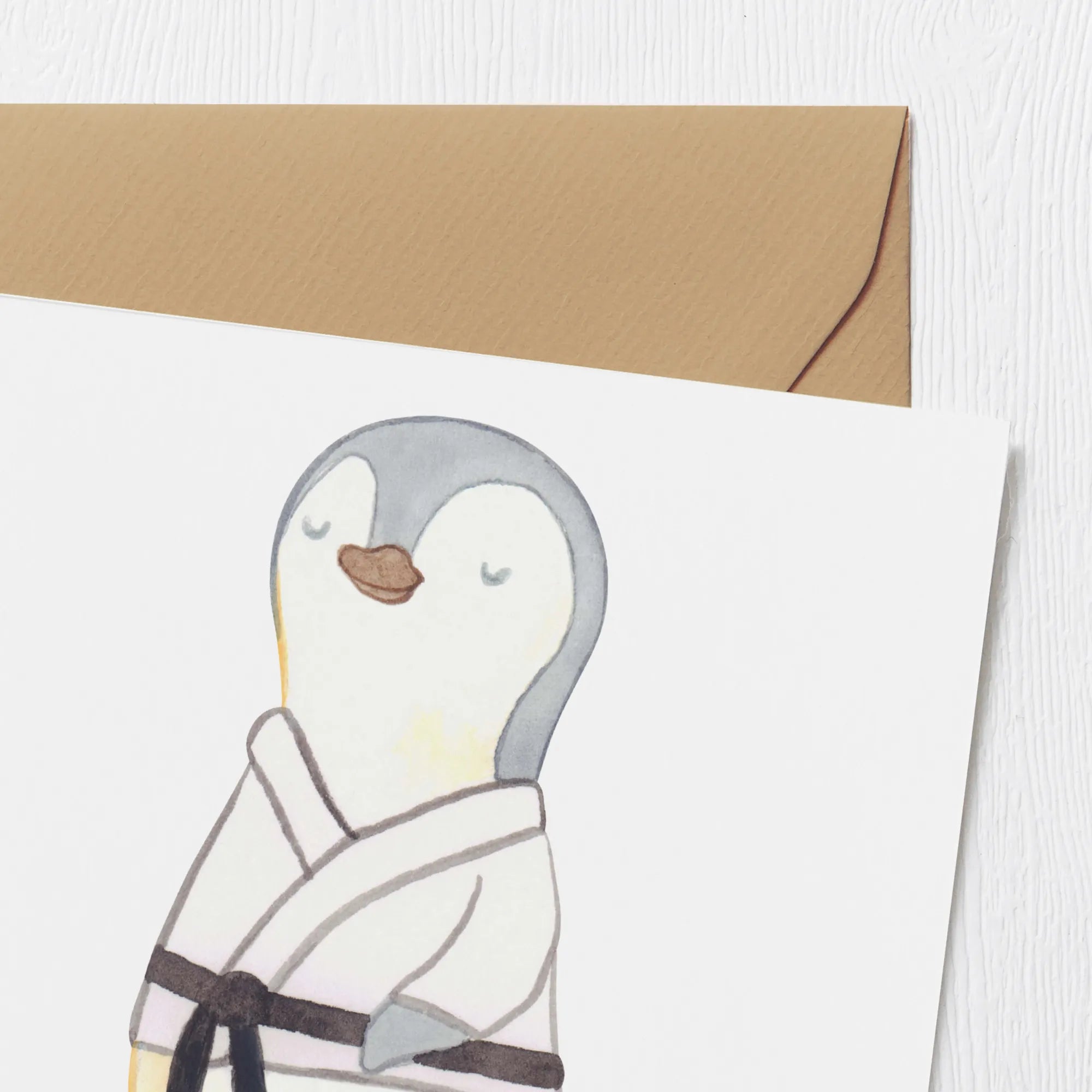 Die Karte zeigt einen süßen, sportlichen Pinguin im Karateanzug, der begeistert in seiner Kampfkunst praktiziert. Perfekt für Mitglieder eines Karate Vereins oder für jemanden, der Karate als Hobby betreibt.