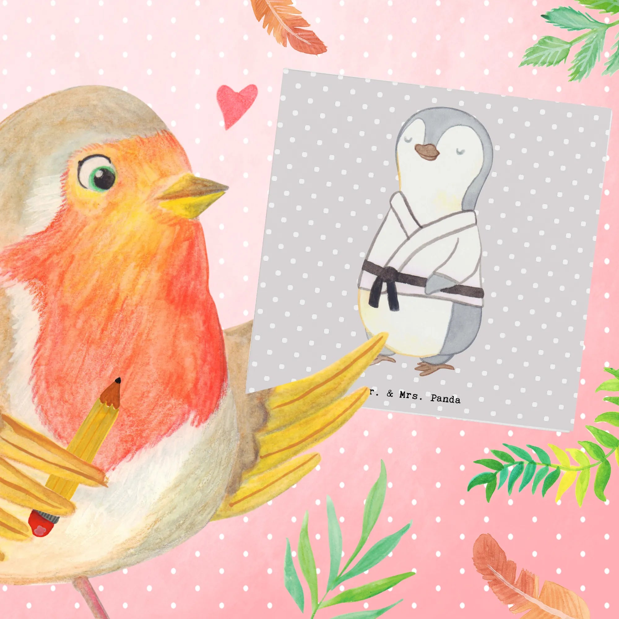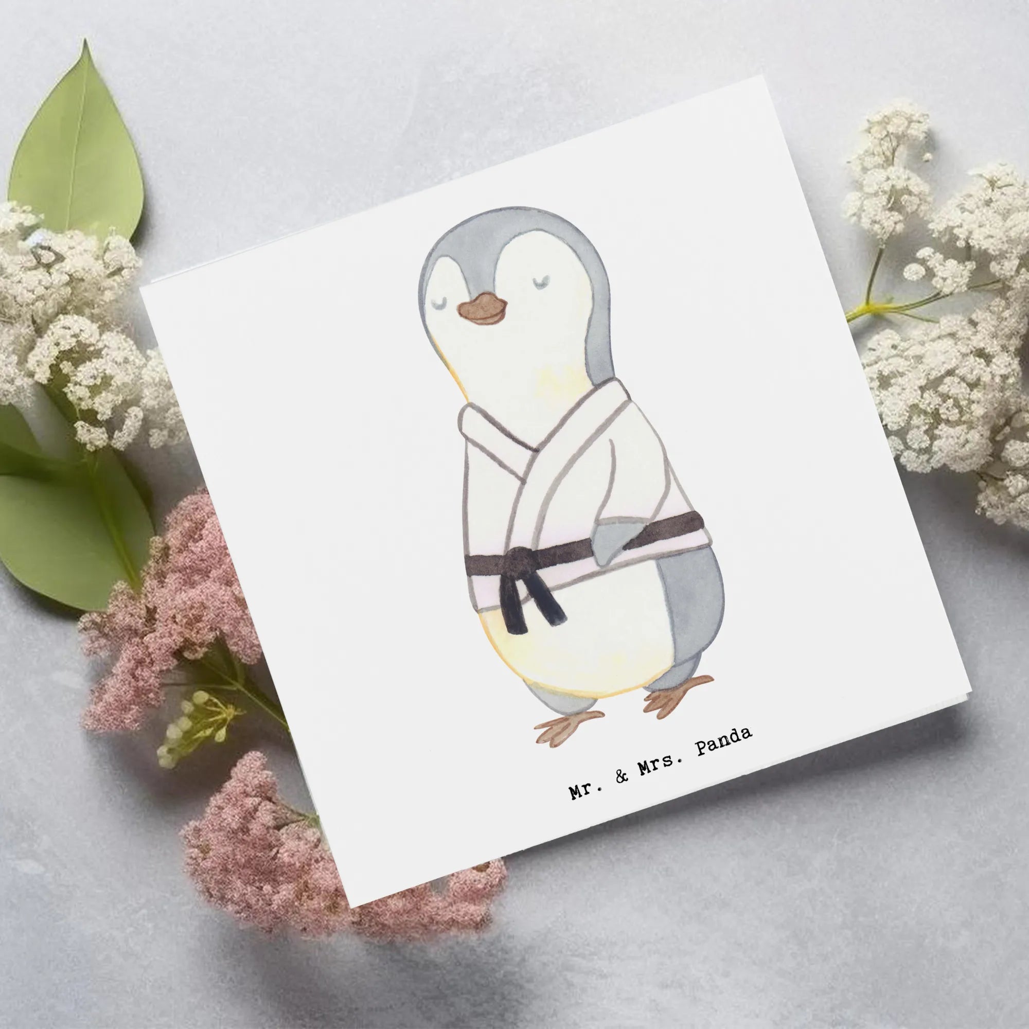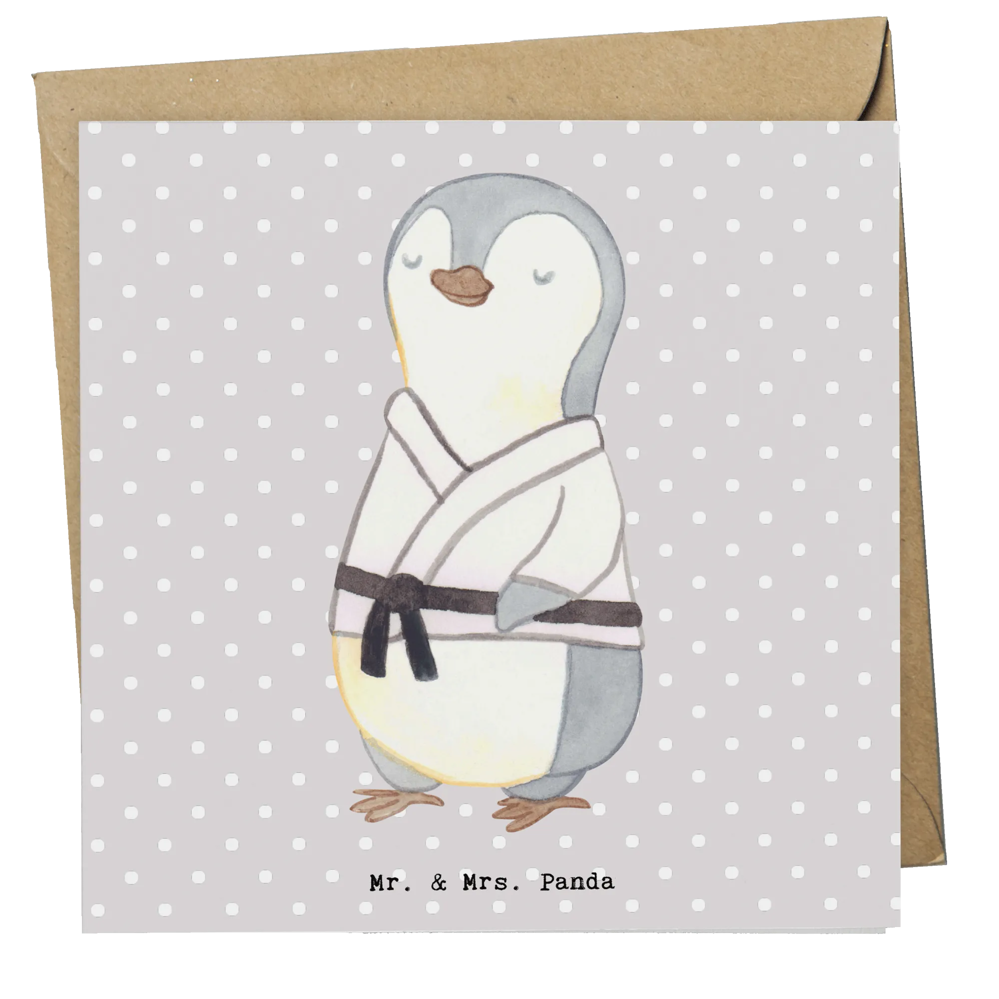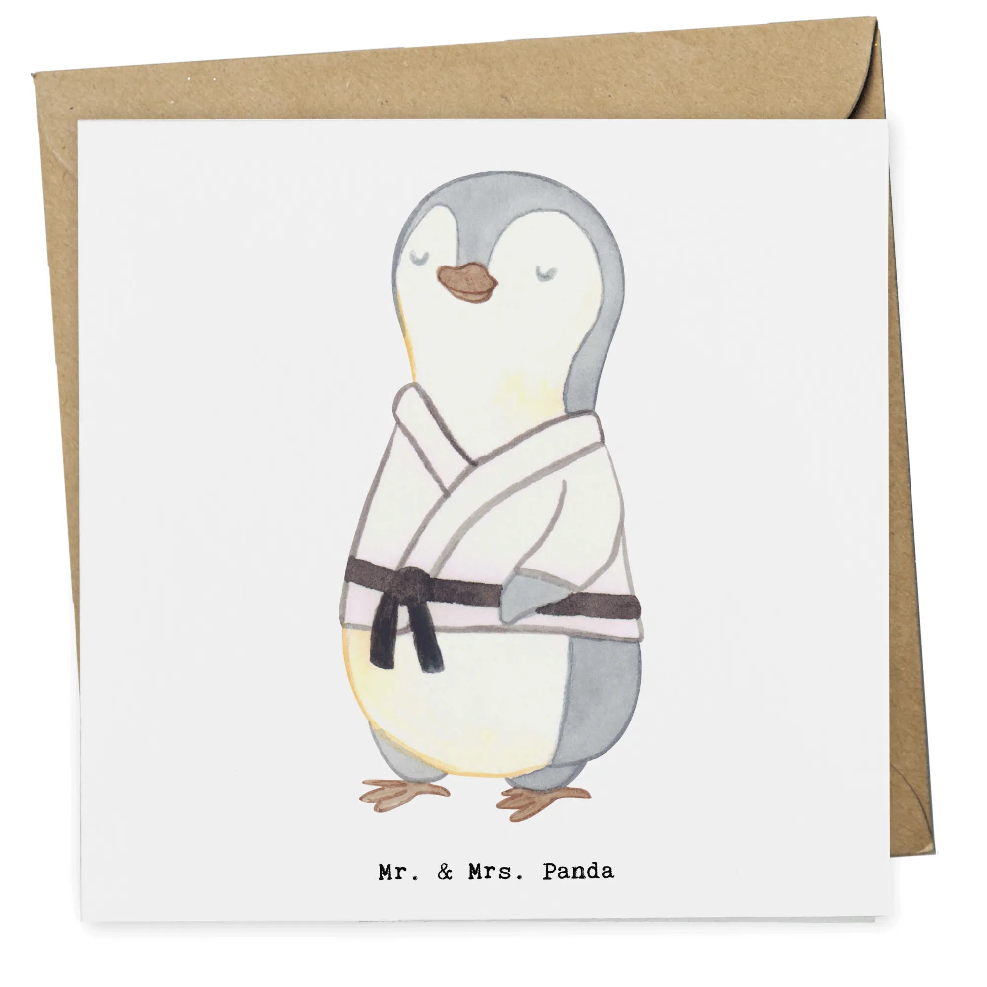 Die Karte zeigt einen süßen, sportlichen Pinguin im Karateanzug, der begeistert in seiner Kampfkunst praktiziert. Perfekt für Mitglieder eines Karate Vereins oder für jemanden, der Karate als Hobby betreibt.