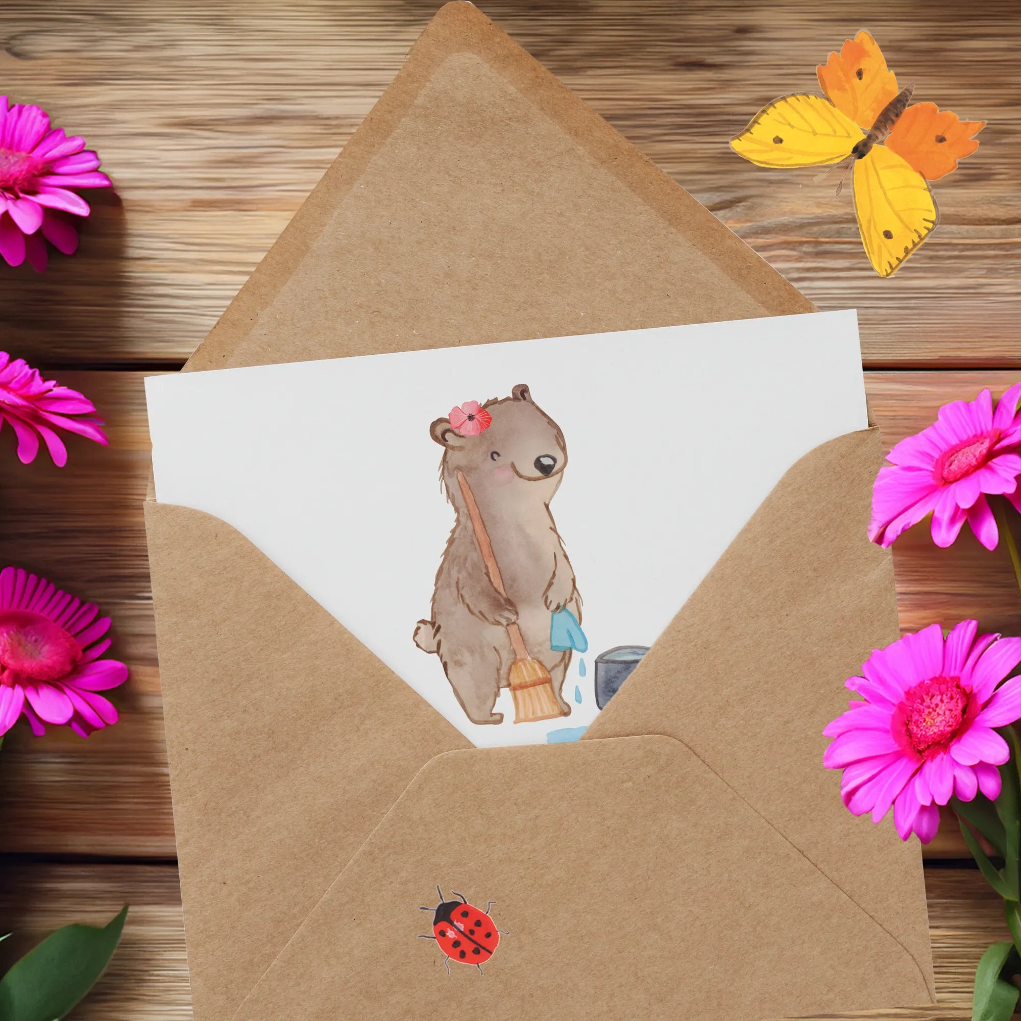 Die Karte ist aus hochwertigem Karton gefertigt und hat die Maße von 140 mm x 140 mm, was sie ideal für individuelle Grüße oder Glückwünsche macht. Die Vorderseite ziert ein süßes Motiv eines niedlichen Bären, der mit Leidenschaft und Begeisterung den Boden putzt – ein echtes Highlight für alle, die in dieser Branche arbeiten! Auf der matte Innenseite hast du genügend Platz, um deine eigenen Worte einfließen zu lassen.
