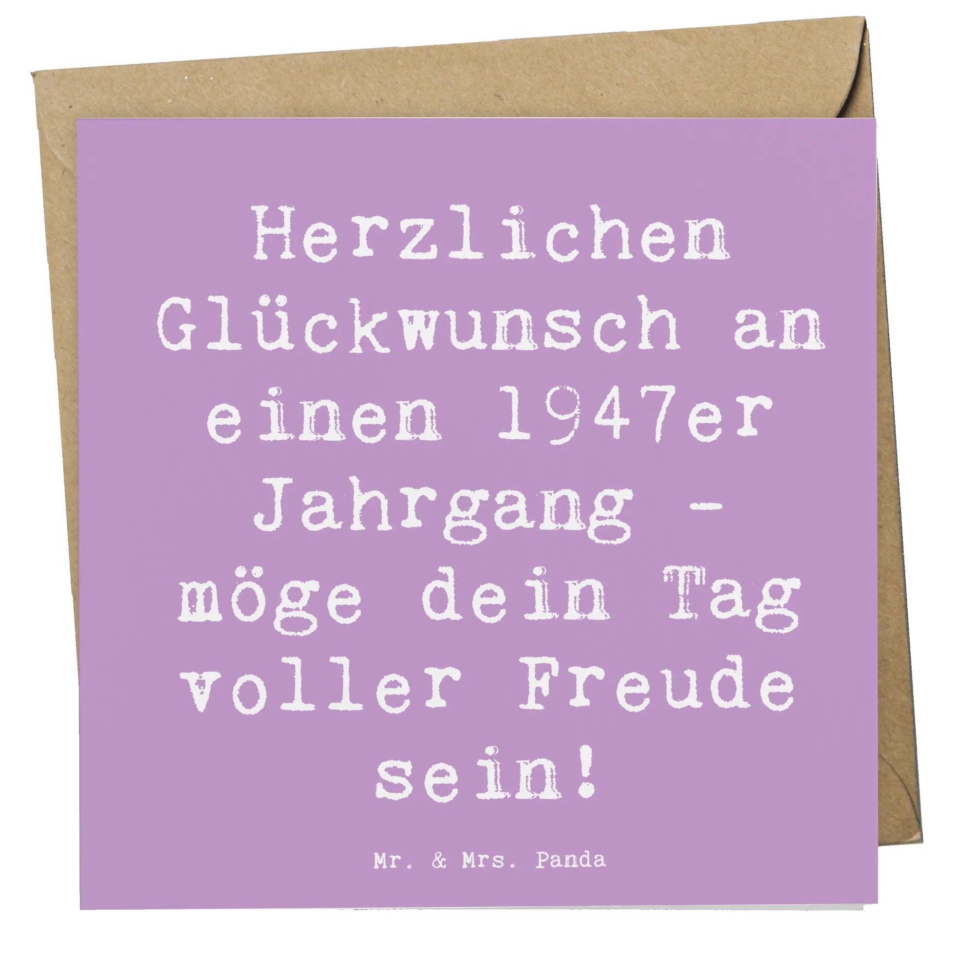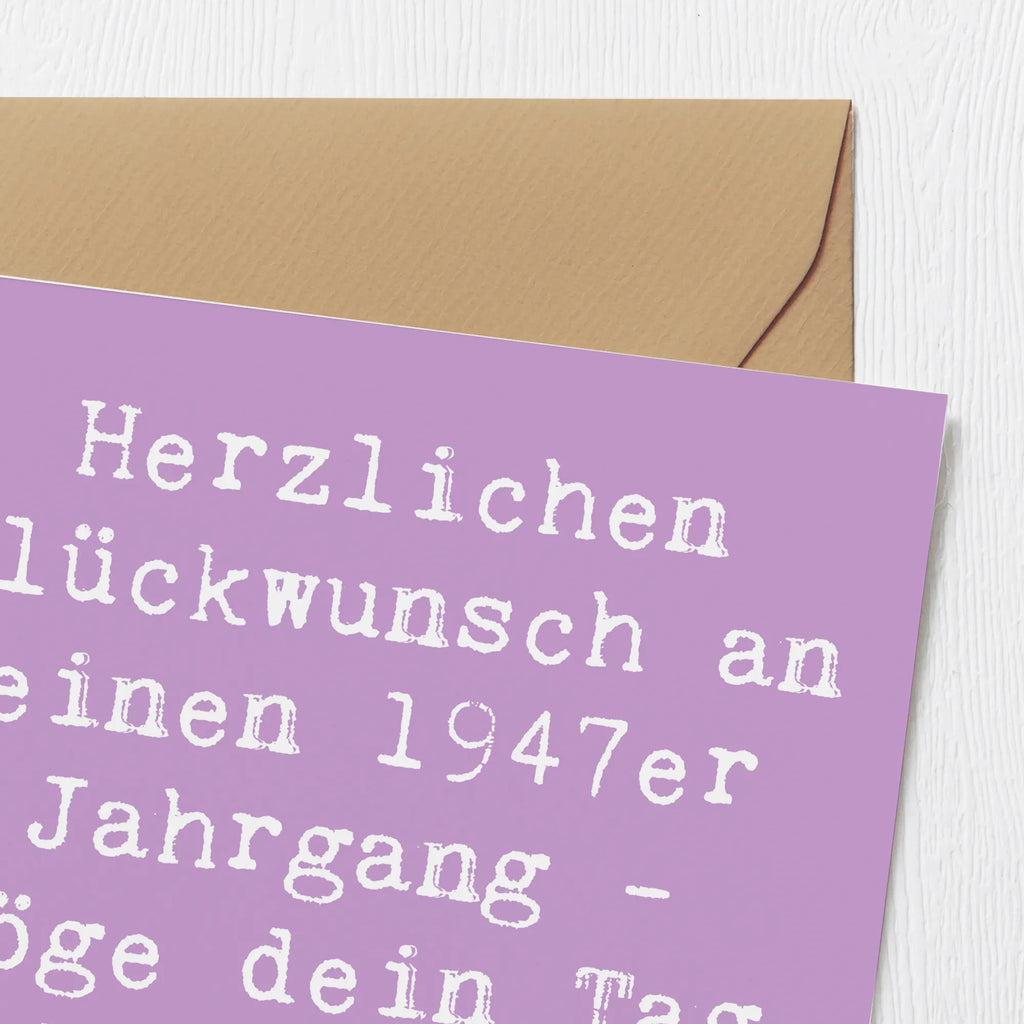 Was diese Karte so besonders macht, ist das liebevoll gestaltete Motiv mit dem Spruch „Herzlichen Glückwunsch an einen 1947er Jahrgang - möge dein Tag voller Freude sein!“. Diese Karte erzählt eine Geschichte, die das Geburtstagskind an seinem besonderen Tag willkommen heißt.