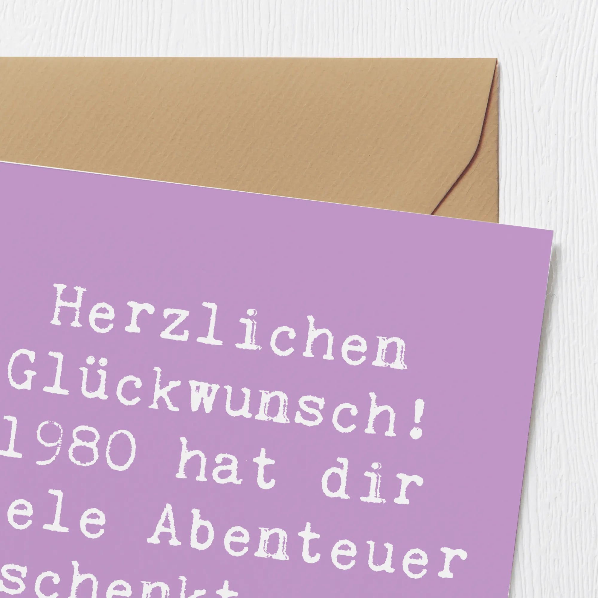 Die Karte ist nicht nur ein Herzstück, sondern auch ein persönliches Andenken an einen unvergesslichen Tag. Die edlen 300 Gramm Hochwertkarton sorgen dafür, dass die Karte nicht nur gut aussieht, sondern sich auch gut anfühlt. Auf der Vorderseite prangt der liebevolle Spruch: "Herzlichen Glückwunsch! 1980 hat dir viele Abenteuer geschenkt - auf viele weitere!" Dieser Slogan ist perfekt, um zu reflektieren, wie gesegnet die Jahre sein können und wie viele weitere Abenteuer noch bevorstehen.