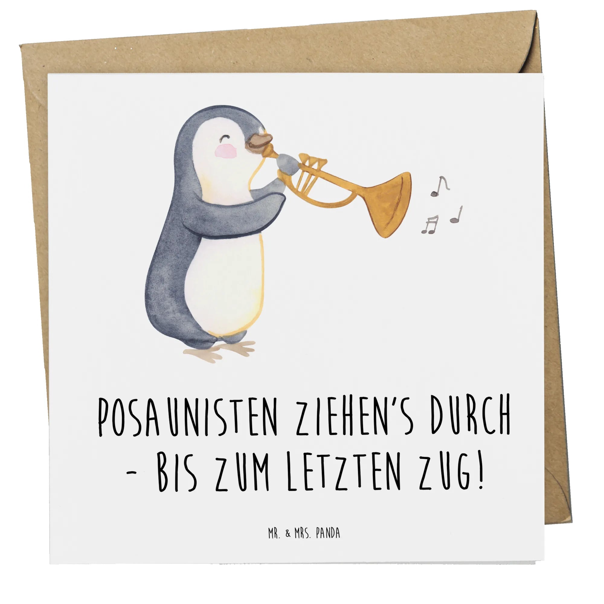 "Posaunisten ziehen's durch - bis zum letzten Zug!" ist der Slogan, der Musiker und Musikfreunde gleichermaßen anspricht und ihnen ein Lächeln ins Gesicht zaubert. Ergänzt wird diese exquisite Karte durch einen passenden edlen Umschlag, sodass sie bereit ist, verschenkt zu werden!