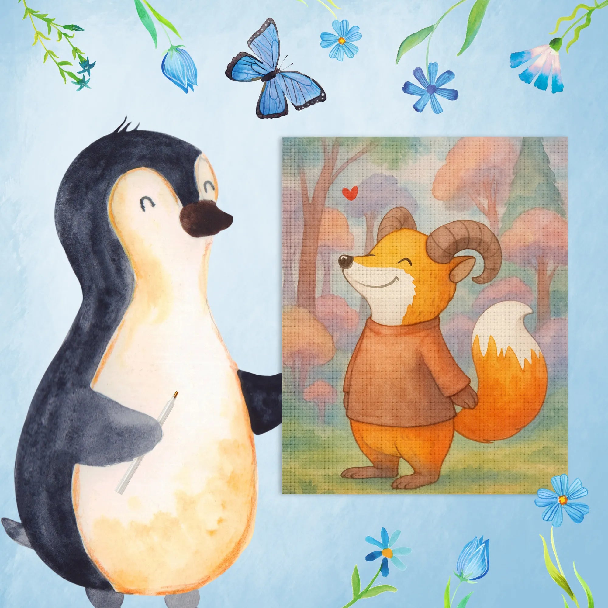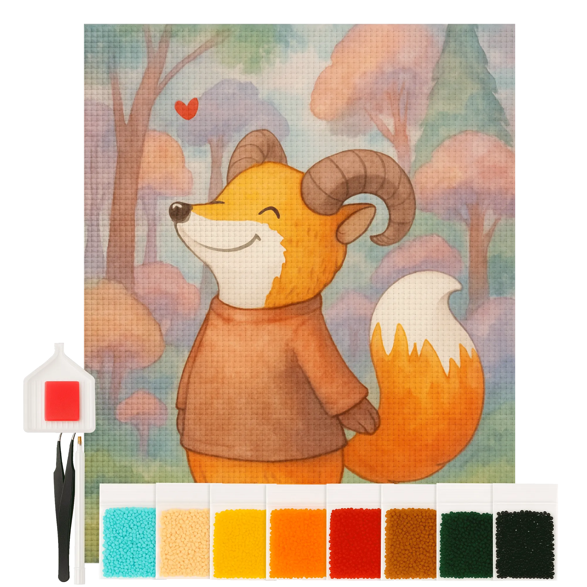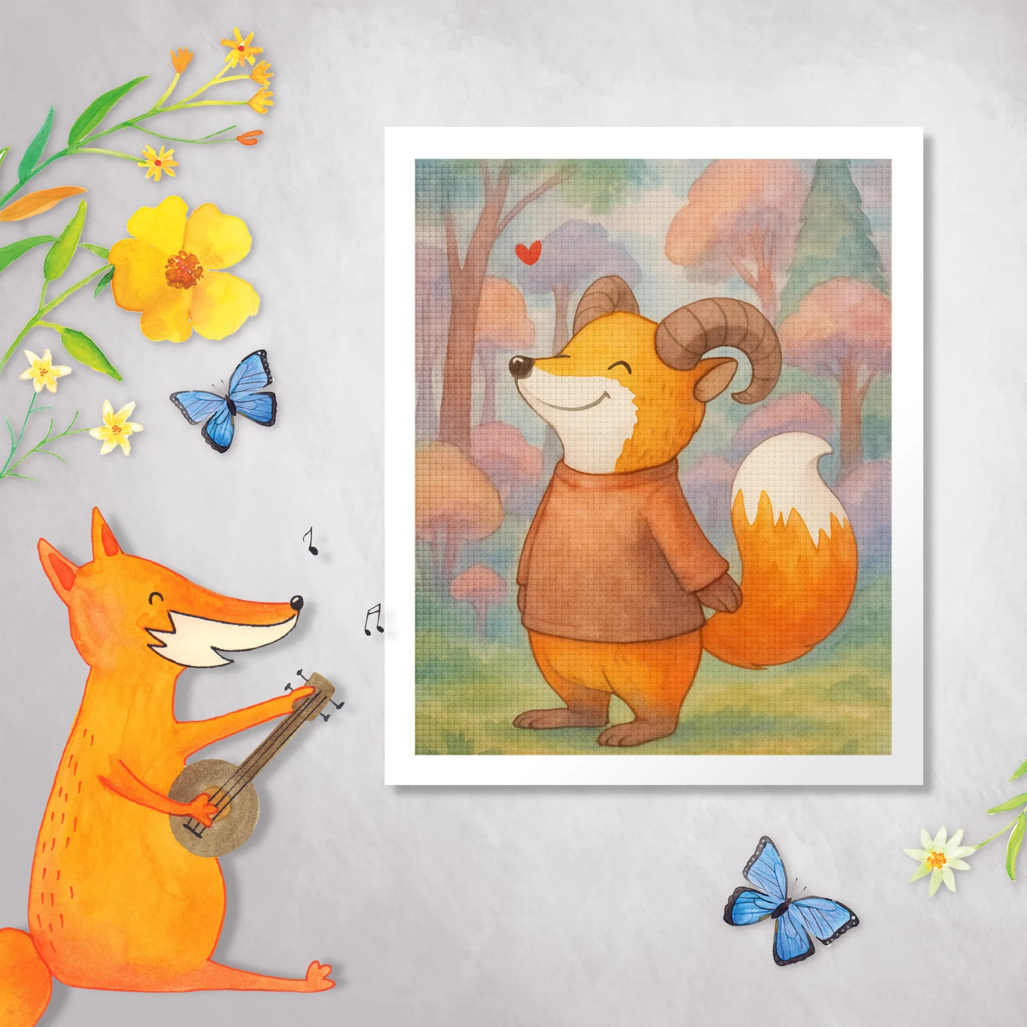 Das 'Widder Astrologie'-Motiv verschmilzt die ungezähmte Energie eines Widders mit der Charmanz eines Fuchses. Die große, geschwungene Hörner und das strahlende, zufrieden wirkende Gesicht verleihen dem Charakter eine unverwechselbare Ausstrahlung. Die warme Farbpalette von Gelbtönen bis hin zu ruhigen Orangetönen strahlt Gemütlichkeit und Freude aus. Der buschige Schwanz, der in feurigen Tönen gestaltet ist, verstärkt das dynamische Erscheinungsbild des Widders weiter. Ein kleines rotes Herz darüber lässt nicht nur das Bild strahlen, sondern verbreitet auch positive Vibes. Ob als Geburtstagsgeschenk für einen Widder oder einfach als dekorativer Akzent in euren vier Wänden – dieses Motiv erinnert daran, dass unsere einzigartigen Eigenschaften etwas ganz Besonderes sind und uns Freude bringen können.