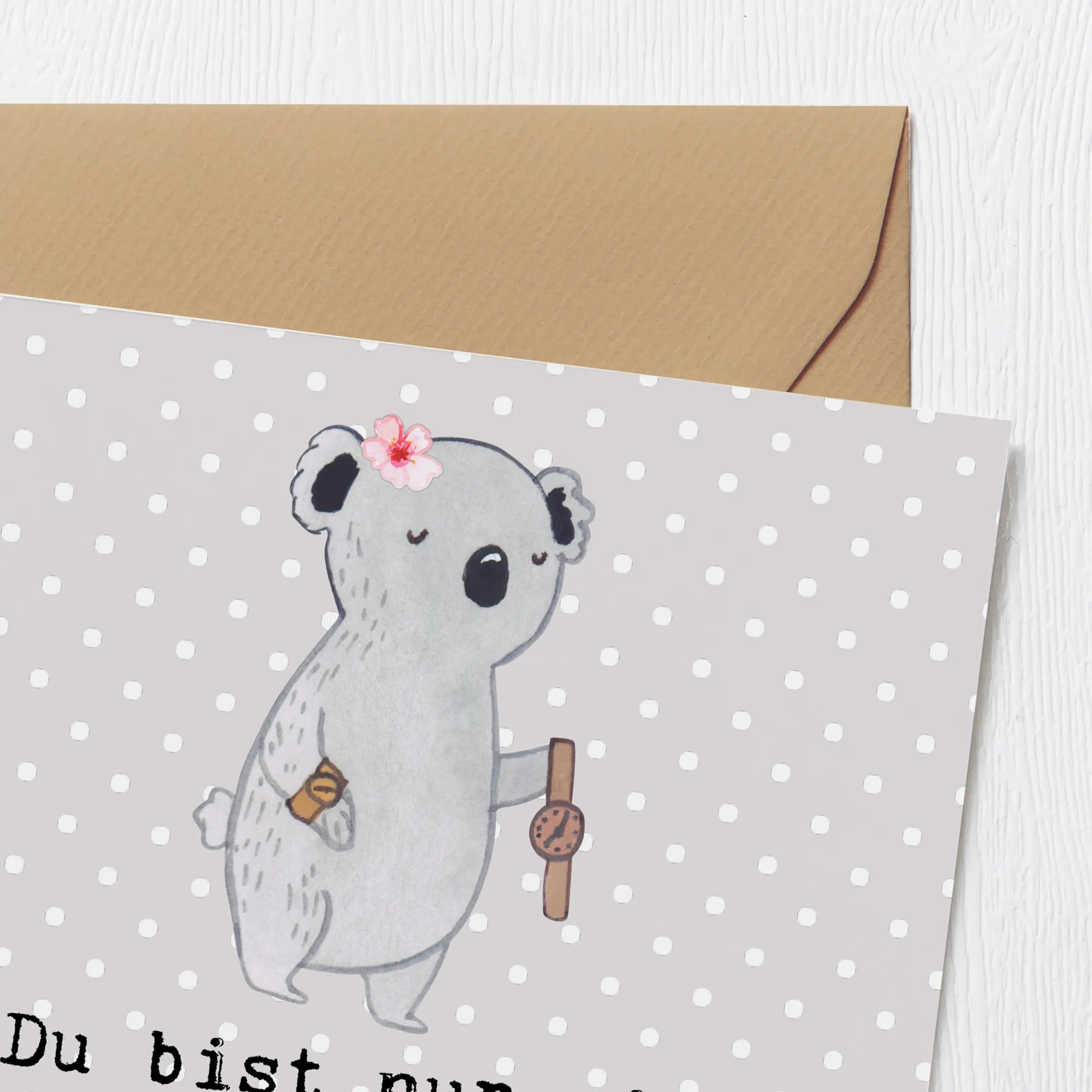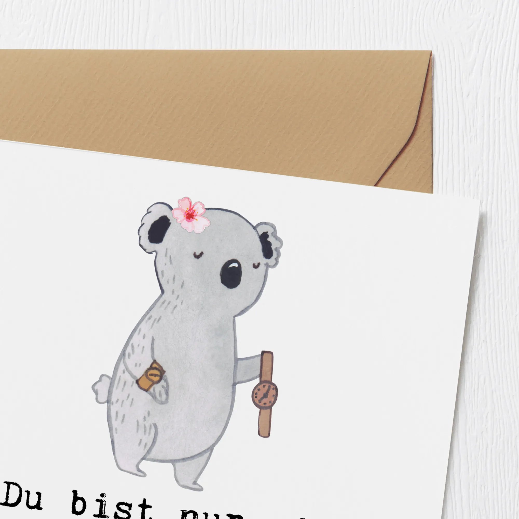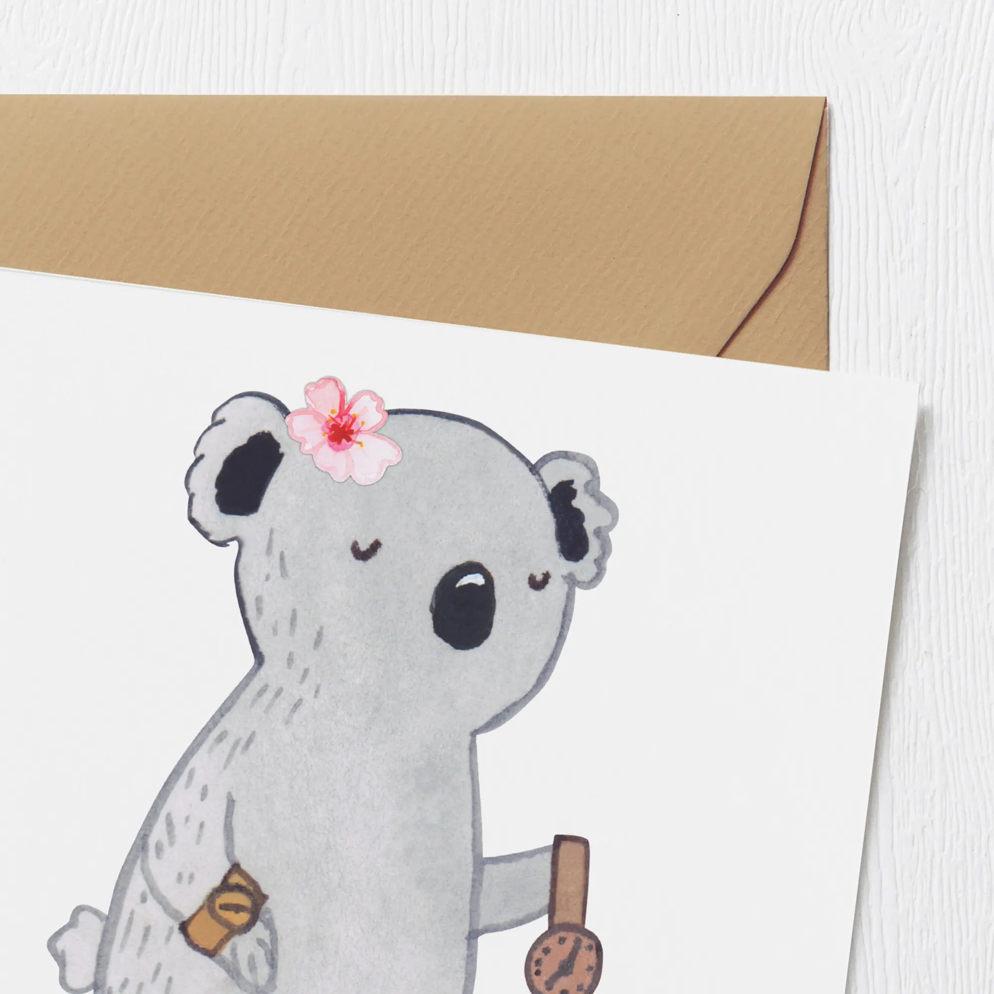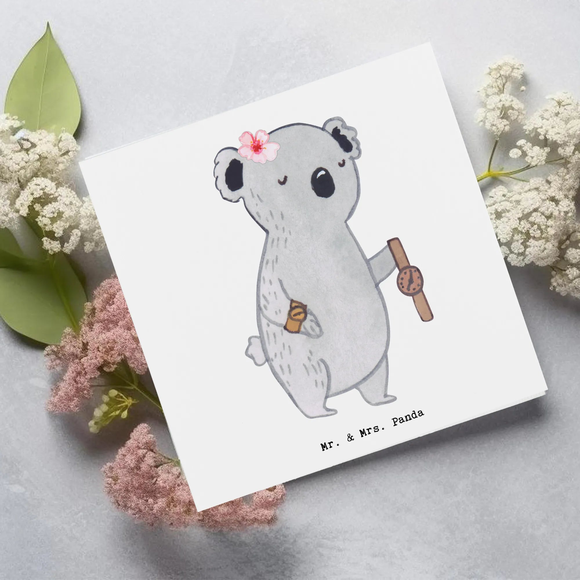 Uhrmacherin mit Herz – handgezeichnete Koala-Illustration mit goldener Armbanduhr, ideale Geschenkidee