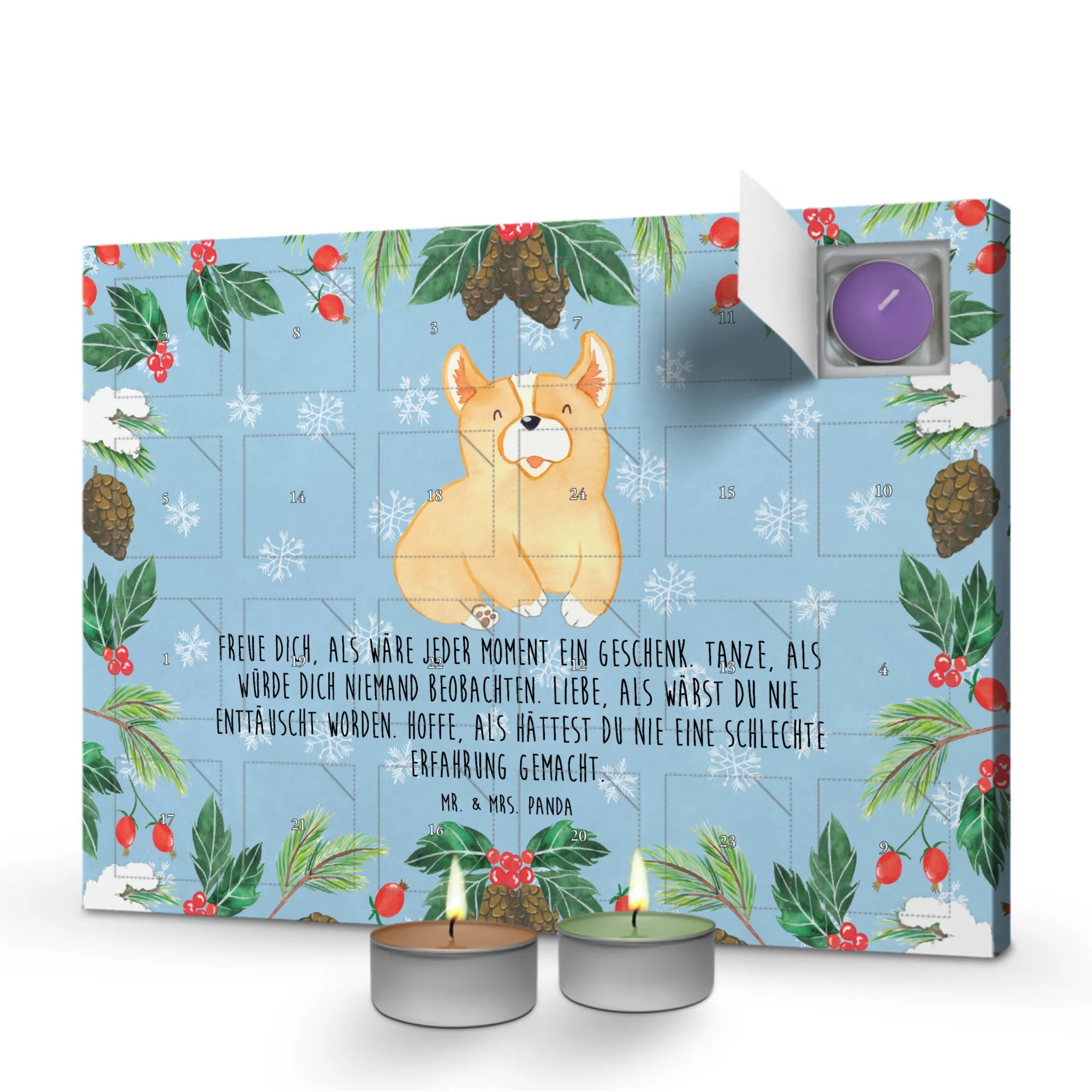 Der wunderschöne Duftkerzen Adventskalender von Mr. & Mrs. Panda ist das perfekte Geschenk für alle Hundeliebhaber und Tierfreunde. Mit einem charmanten Corgie-Motiv und einem inspirierenden Spruch, der besagt: "Freue dich, als wäre jeder Moment ein Geschenk. Tanze, als würde dich niemand beobachten. Liebe, als wärst du nie enttäuscht worden. Hoffe, als hättest du nie eine schlechte Erfahrung gemacht." bringt dieser Adventskalender Wärme und gute Laune in die Weihnachtszeit. Er ist nicht nur ein adventlicher Countdown, sondern auch eine wunderschöne Möglichkeit, sich jeden Tag an den kleinen Dingen des Lebens zu erfreuen.