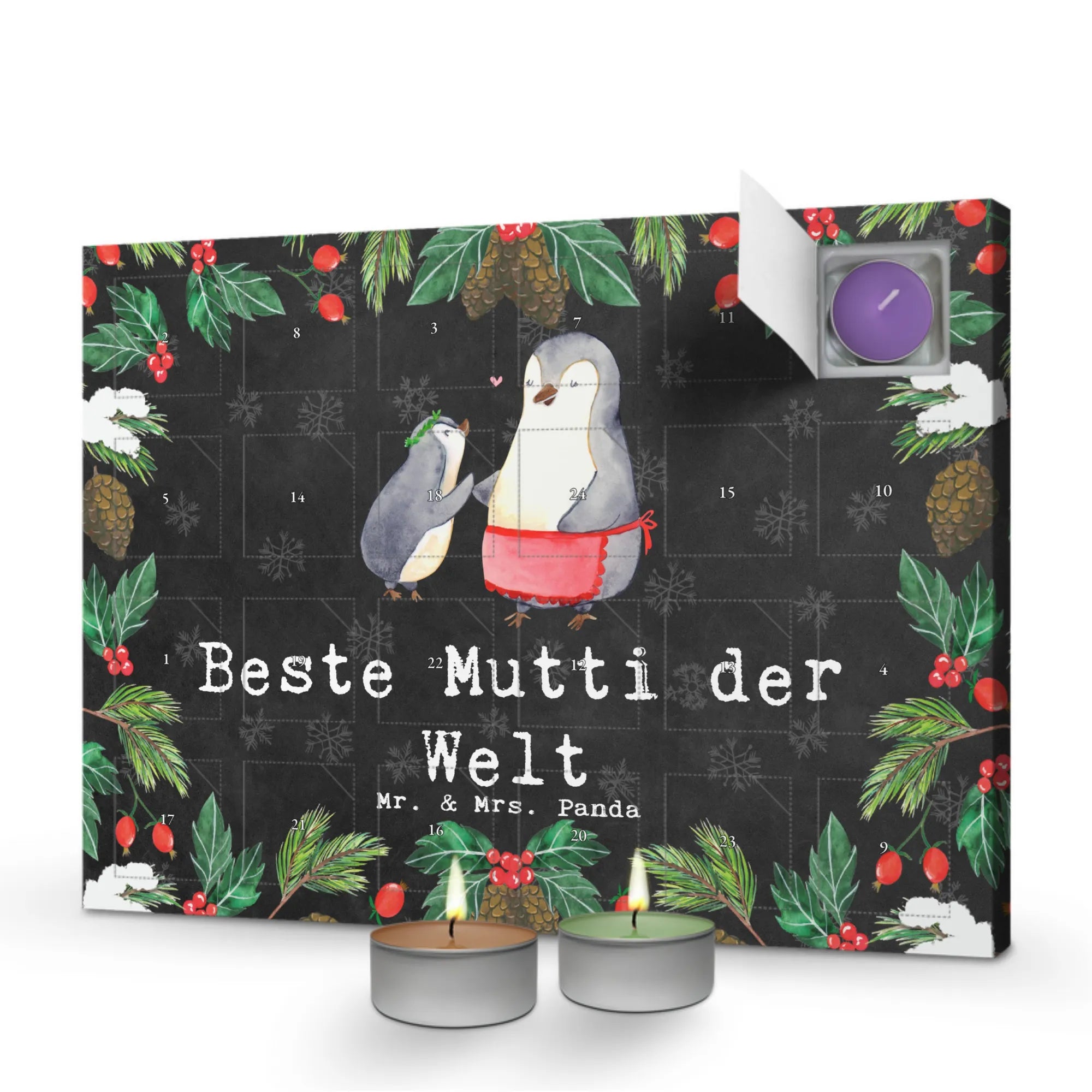 Der Duftkerzen Adventskalender "Pinguin Beste Mutti der Welt" von Mr. & Mrs. Panda ist das perfekte Geschenk für die beste Mama der Welt! Er versüßt die Wartezeit auf Weihnachten und zaubert jeden Tag ein Lächeln ins Gesicht deiner Mutter.