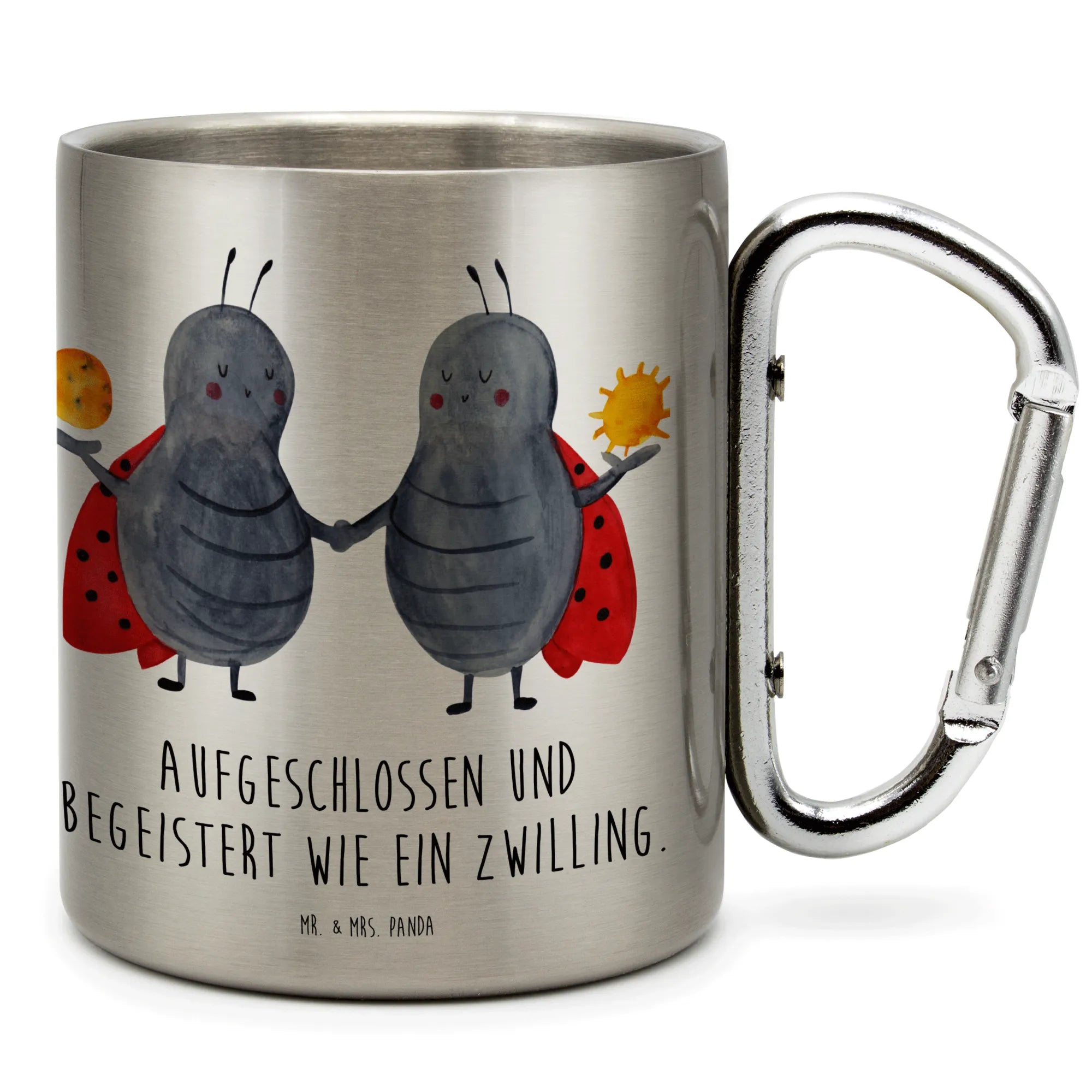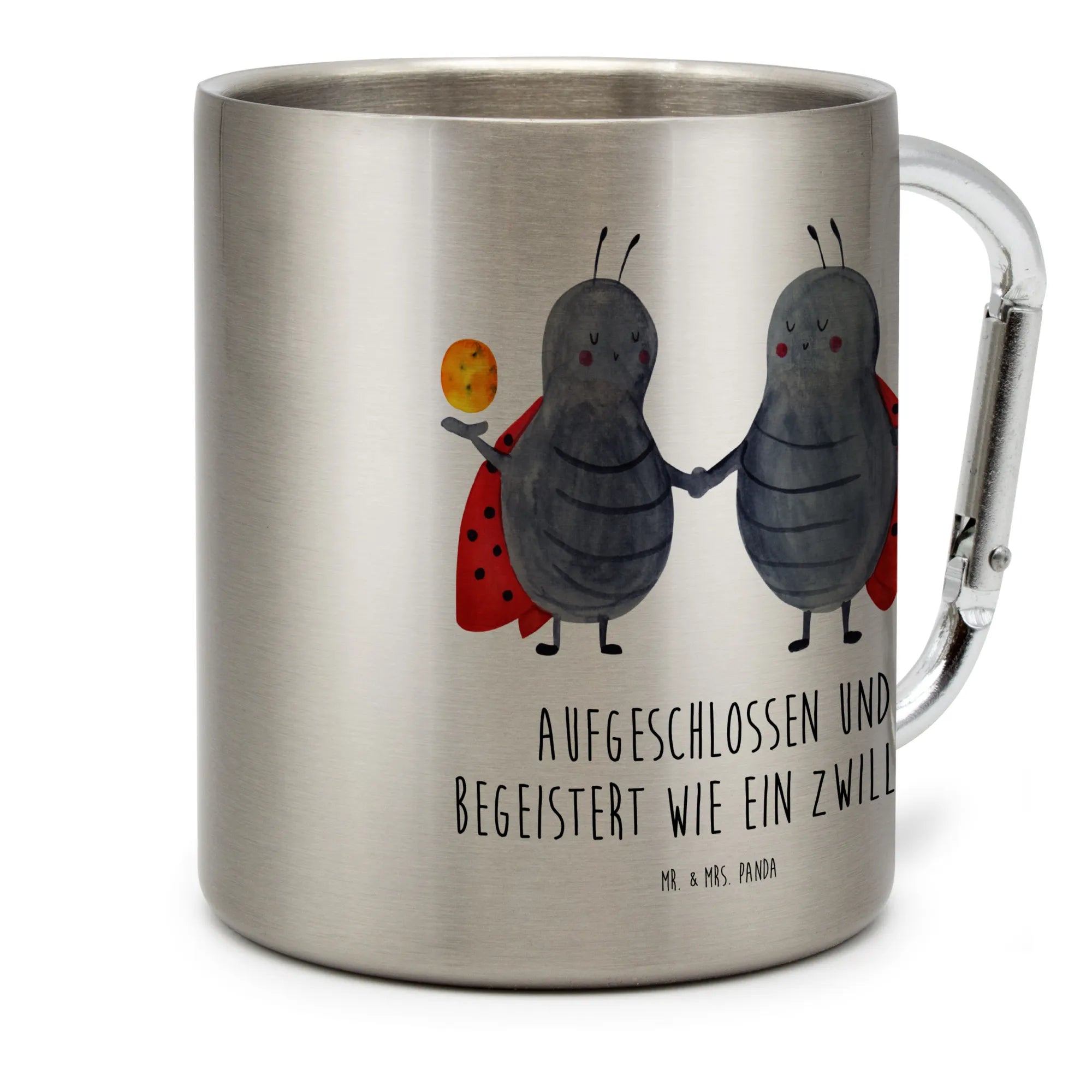 Die beiden niedlichen Marienkäfer auf dem Becher, die die Zwillinge darstellen, vermitteln ein Gefühl von Glück und Fröhlichkeit. Der integrierte Karabinerhaken bietet einen praktischen Nutzen, denn du kannst den Becher einfach an deiner Gürtelschlaufe oder deinem Rucksack befestigen, sodass er immer griffbereit ist.