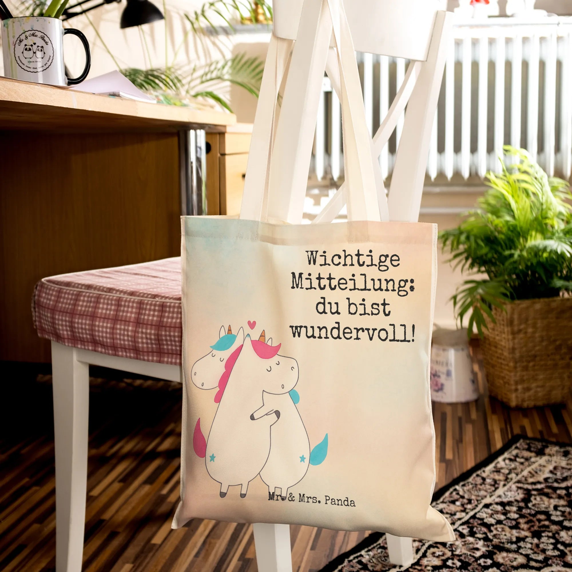 In einem zauberhaften Moment stehen zwei Einhörner, die sich liebevoll umarmen und gegenseitig mit ihrer Zuneigung stärken. Der Spruch 'Wichtige Mitteilung: du bist wundervoll!' bringt sofort Freude und Leichtigkeit in jeden Raum. Gerade für den Valentinstag ist dieses Motiv das perfekte Geschenk, um dem Partner zu zeigen, wie sehr man ihn schätzt. Einhörner stehen für Magie, Hoffnung und die besonderen Momente im Leben, die wir gemeinsam erleben. Die Kombination aus diesen wunderbaren Geschöpfen und der kraftvollen Botschaft macht dieses Design zu einem besonderen Erinnerungsstück, das sowohl im eigenen Zuhause als auch als Geschenk für die Liebsten ein Lächeln zaubert.