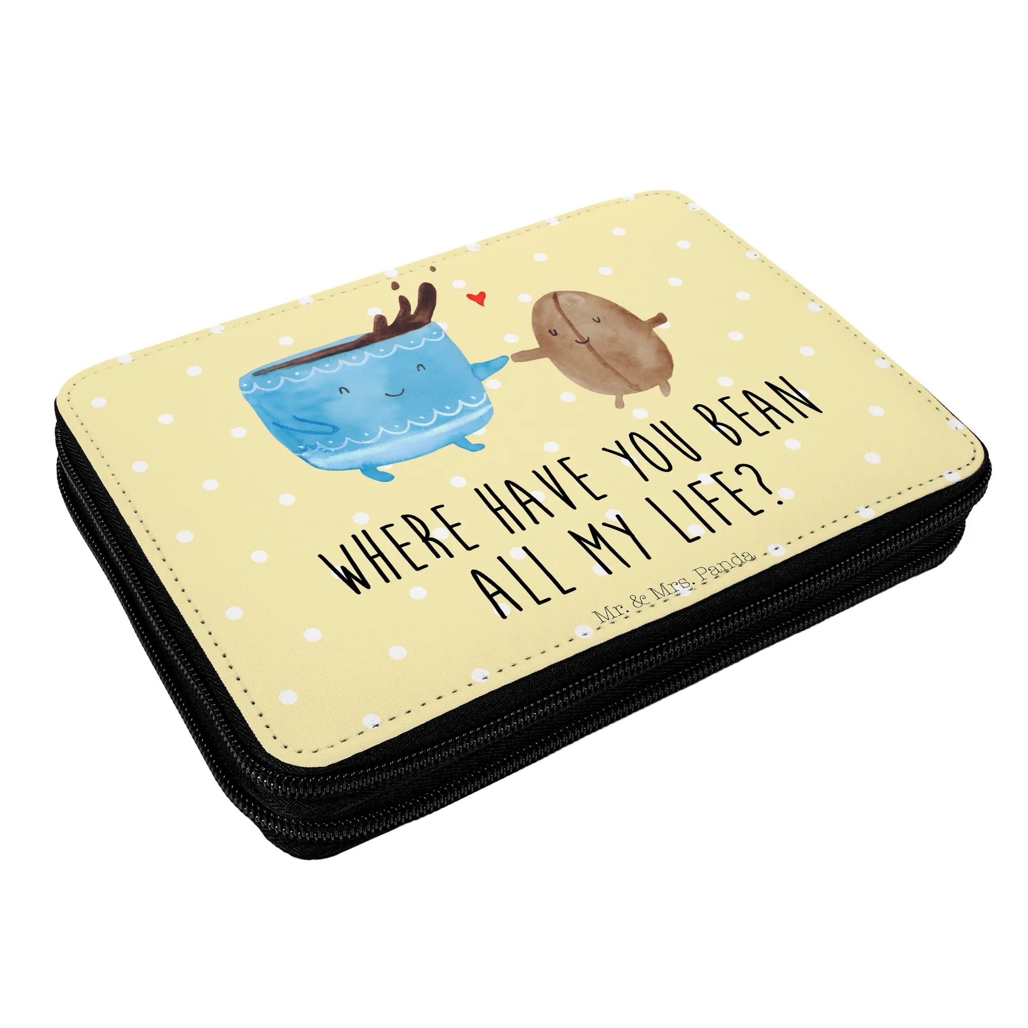 Die wunderschöne Federmappe von Mr. & Mrs. Panda mit dem fröhlichen Kaffee Bohne Motiv ist das perfekte Geschenk für Schulkinder und eine must-have Ausstattung für jeden Schulranzen!