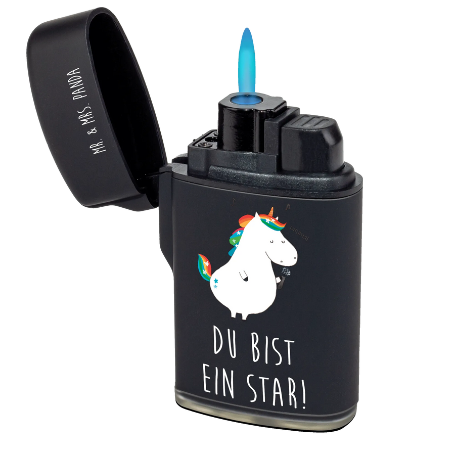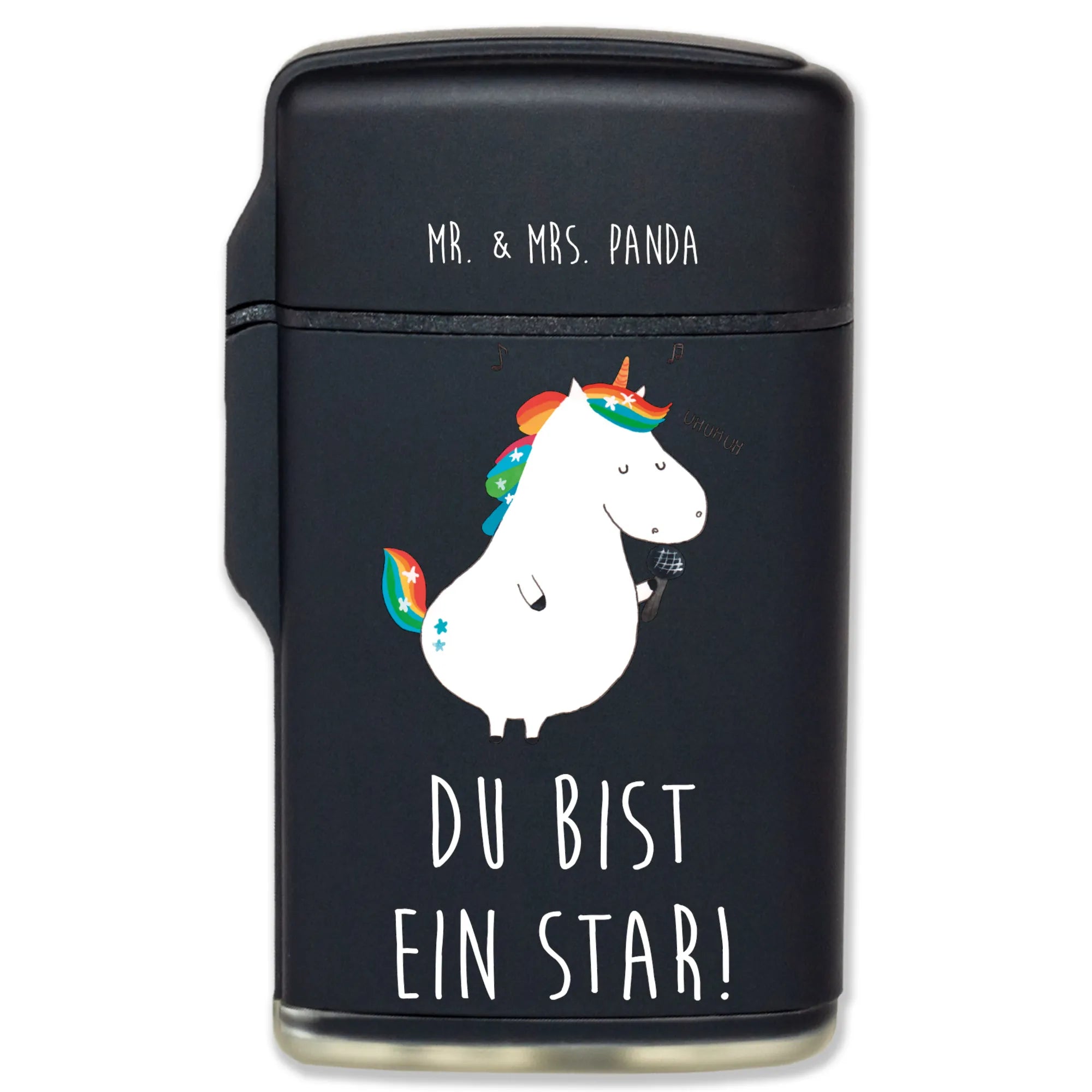 Suchst du das perfekte Geschenk für einen Einhorn-Fan? Unser Feuerzeug Einhorn Sänger aus der zauberhaften Einhorn-Kollektion von Mr. & Mrs. Panda ist genau das Richtige! Dieses außergewöhnliche Feuerzeug begeistert nicht nur mit seinem einzigartigen Motiv, das ein fröhliches Einhorn zeigt, das ins Mikrofon singt, sondern auch mit dem liebevollen Slogan "Du bist ein Star!". Damit ist es das ideale Geschenk für alle, die die magische Welt der Einhörner lieben. Ob zum Geburtstag, für eine Feier oder einfach nur so, dieses Feuerzeug bringt Freude in jedes Herz.