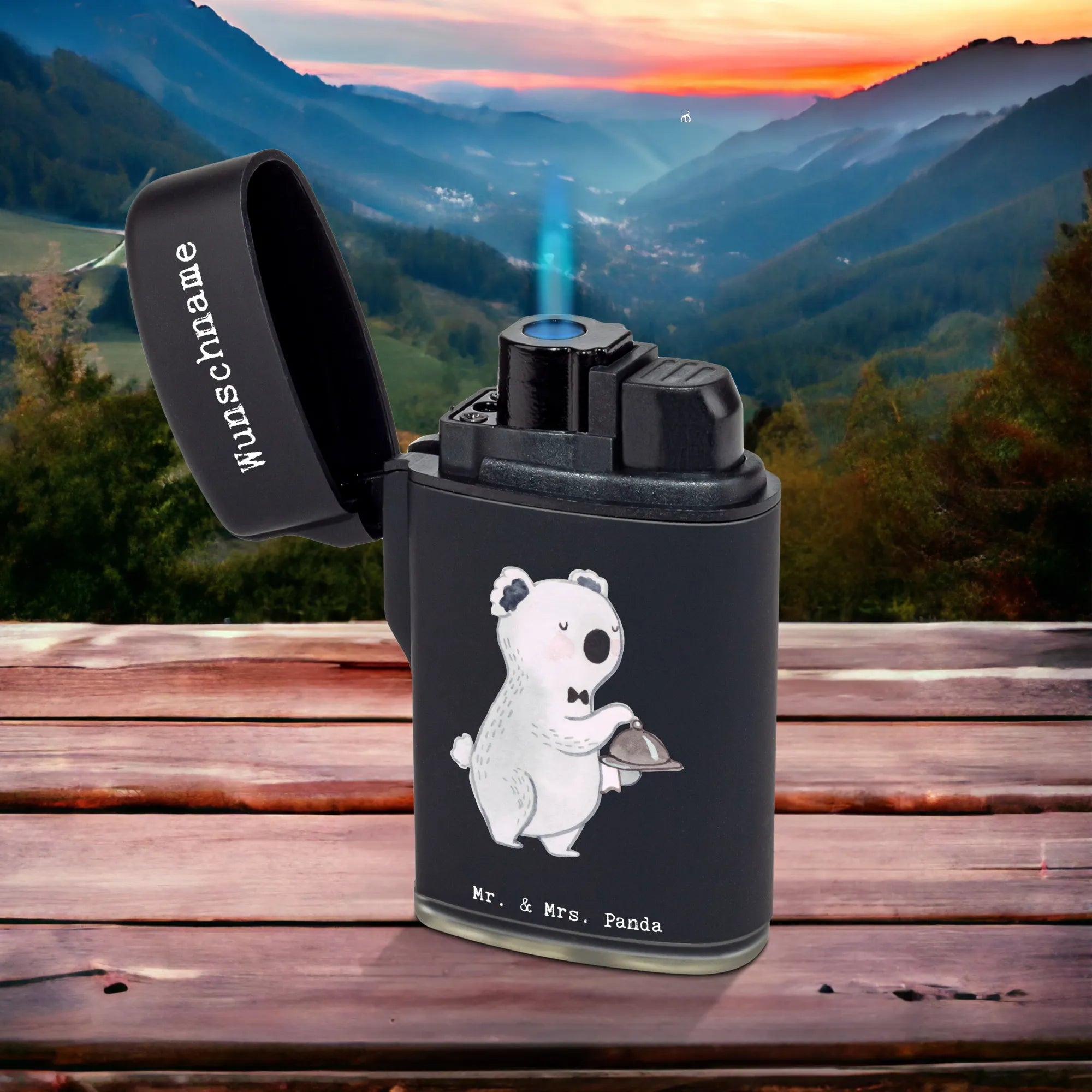 Personalisiertes Feuerzeug Restaurantfachmann mit Herz – das perfekte Geschenk für alle, die ihren Beruf mit Herz leben. Unser süßer Koala serviert mit einem Lächeln und dem Spruch "Du bist nur ein halber Mensch, wenn du kein Restaurantfachmann bist." ein besonderes Dankeschön an Auszubildende, Kolleginnen und Kollegen oder langjährige Mitarbeiter.