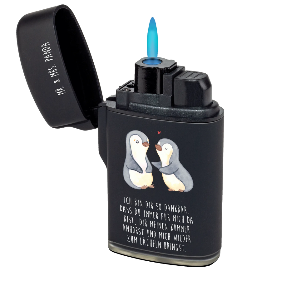 Mit dem zärtlichen Anblick der beiden Pinguine, die sich gegenseitig Trost spenden, wird dieses Feuerzeug zum echten Liebesbeweis. Ideal als Geschenk für Frauen und Männer, egal ob zum Valentinstag, zum Jahrestag, Hochzeitstag oder einfach so. Der liebevolle Slogan "Ich bin dir so dankbar, dass du immer für mich da bist, dir meinen Kummer anhörst und mich wieder zum Lächeln bringst" wird garantiert Herzen höher schlagen lassen!