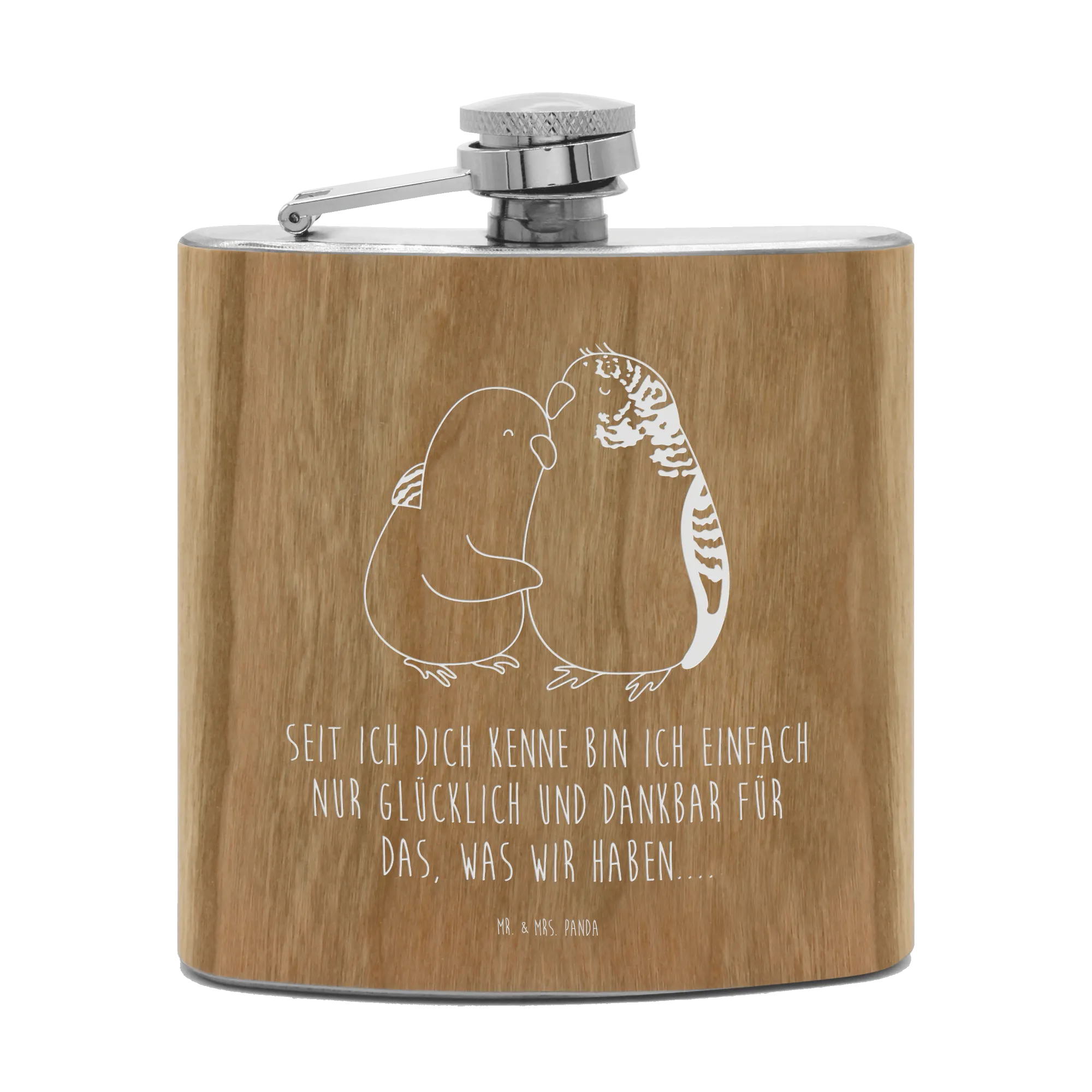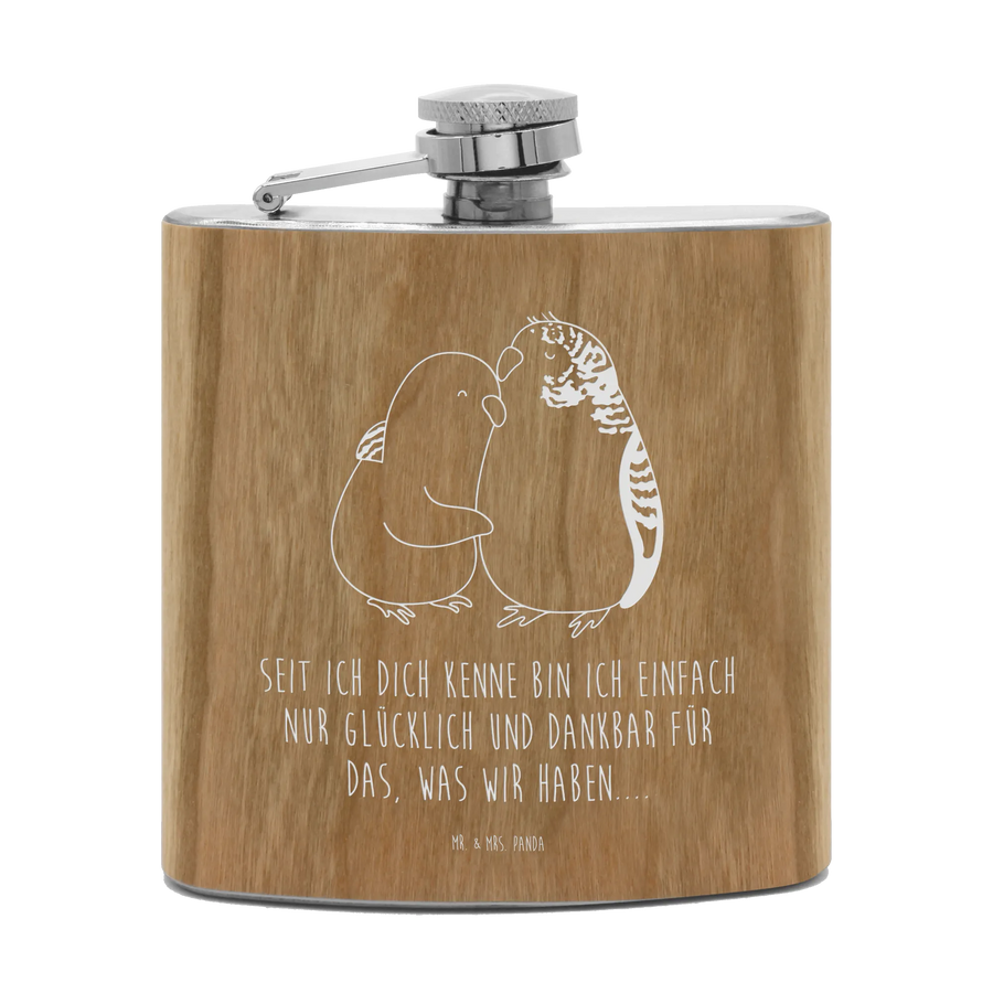 Der Flachmann von Mr. & Mrs. Panda ist das perfekte Accessoire für alle, die gerne unterwegs sind. Er hat kompakte Maße von 109 mm x 93 mm x 22 mm und ein Füllvolumen von 150 ml. Hergestellt aus robustem Edelstahl und ummantelt mit schönem Holzlaminat, ist dieser Flachmann nicht nur funktional, sondern auch ein echter Hingucker. Die exquisite Gravur mit humorvollen Sprüchen und süßen Motiven macht ihn zu einem besonderen Geschenk. Ob für einen Junggesellenabschied, beim Wandern oder einfach nur zum Feiern mit Freunden, dieser Flachmann ist superleicht und lässt sich leicht transportieren. Er liegt angenehm in der Hand und ist zudem mit einem sicheren Schraubverschluss ausgestattet, sodass du dir keine Sorgen um Auslaufen machen musst. Pflege ihn einfach mit heißem Wasser, um die Qualität zu erhalten, denn er ist nicht spülmaschinenfest!