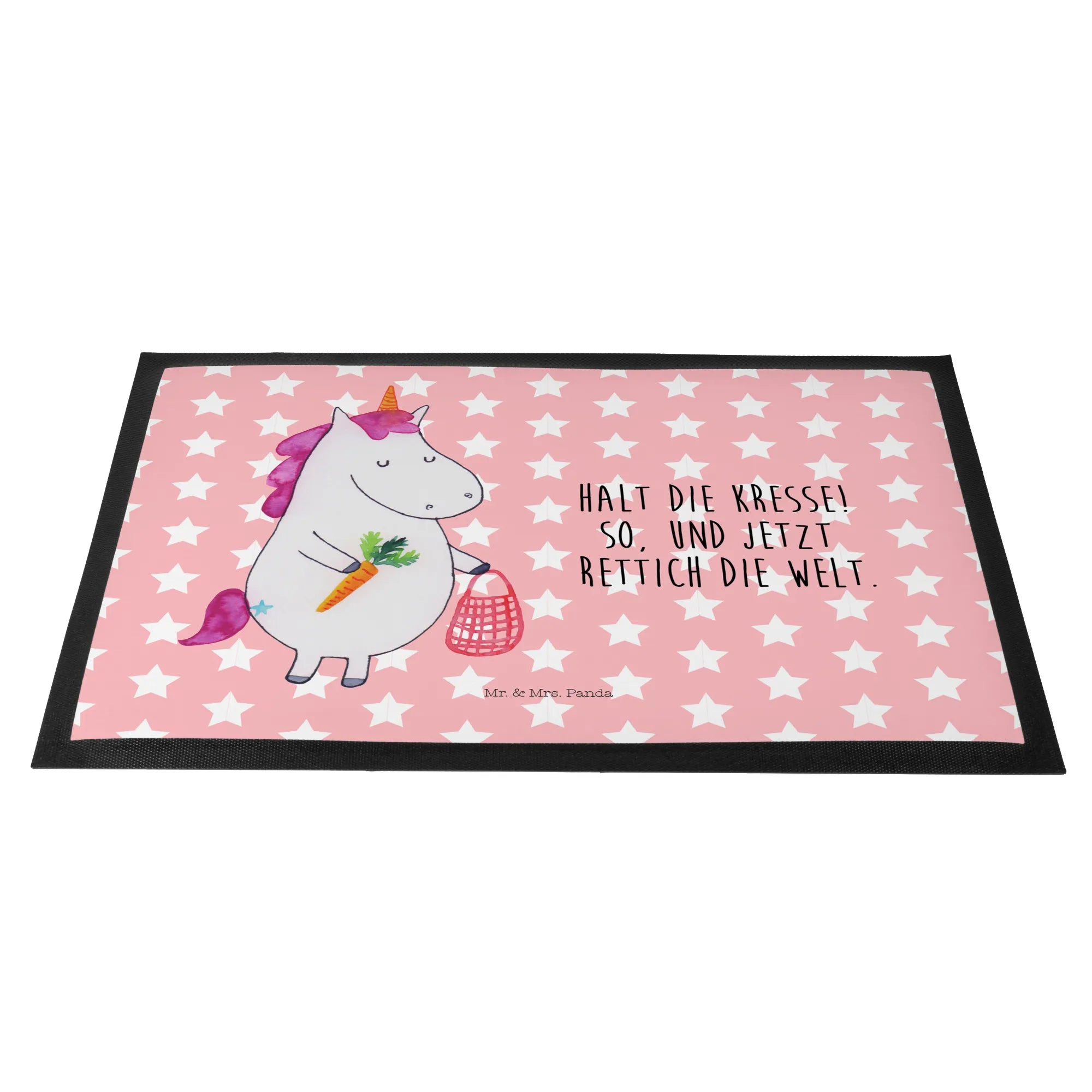 Entdecke die zauberhafte Fußmatte mit dem Motiv 'Einhorn Gemüse' aus unserer einzigartigen Einhorn-Kollektion von Mr. & Mrs. Panda! Diese wunderschöne und hochfunktionale Fußmatte bringt nicht nur Freude in deinen Eingangsbereich, sondern sorgt auch dafür, dass Schmutz und Dreck draußen bleiben.