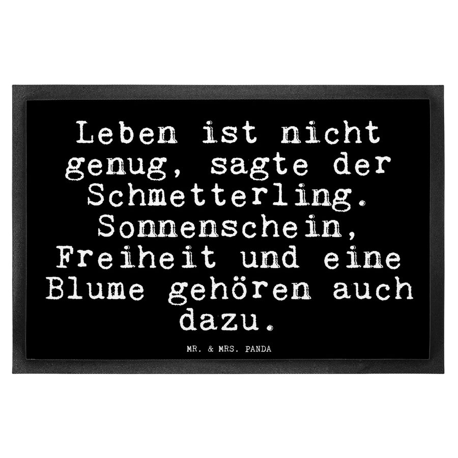 Die Mr. & Mrs. Panda Fußmatte mit dem liebevollen Spruch 'Leben ist nicht genug, sagte der Schmetterling. Sonnenschein, Freiheit und eine Blume gehören auch dazu.' ist nicht nur eine ansprechende Dekoration für deinen Eingangsbereich, sondern auch ein praktischer Schmutzfänger, der für Sauberkeit sorgt. Die Matte hat die perfekten Maße von 40 cm x 60 cm und besteht aus robustem, abriebfestem Polyesterfilz, der Wetterbedingungen standhält. Mit ihrem breiten Gummirand verhindert sie, dass die Matte ausfranst, und sorgt dafür, dass du sicher darüber läufst.