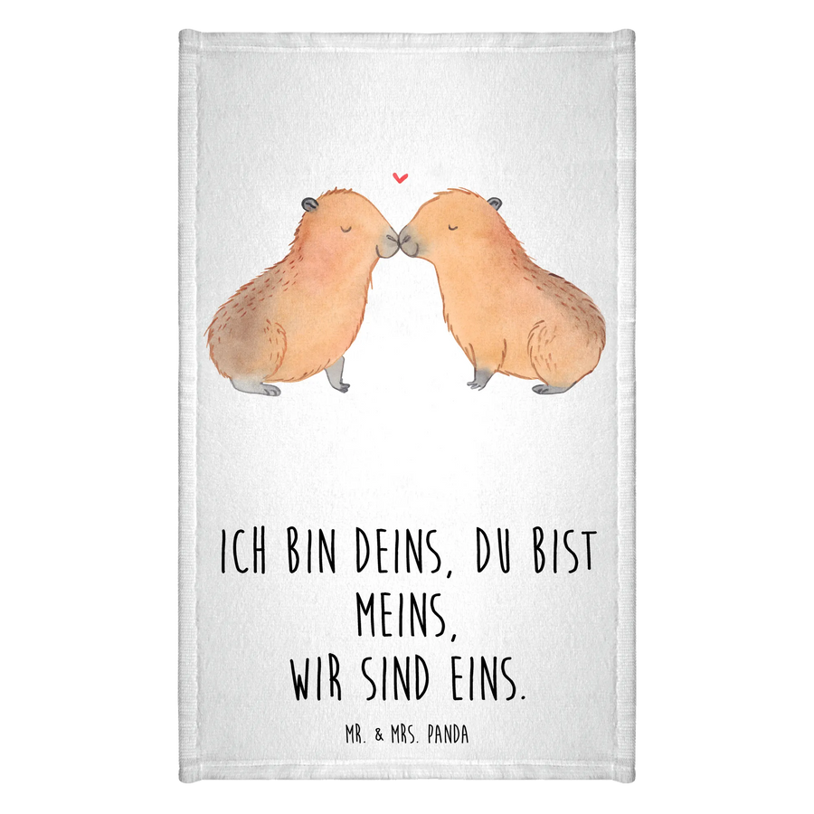 Das süße Gästetuch mit dem romantischen Motiv der kuschelnden Capybaras von Mr. & Mrs. Panda ist das perfekte Geschenk für deinen Liebsten oder deine Liebste. Handgezeichnet mit viel Liebe zeigt es ein zauberhaftes Paar, das sich zärtlich an der Nase berührt – ein Symbol für eure innige Verbindung. Mit dem einfühlsamen Liebesspruch "Ich bin deins, du bist meins, wir sind eins." wird dieses Handtuch zu einem herzerwärmenden Geschenk, das die Liebe in eurer Beziehung feiert. Die Capybaras sind in sanften Brauntönen gehalten, während ein kleines rotes Herz über den beiden schwebt und ihre Zuneigung symbolisiert.