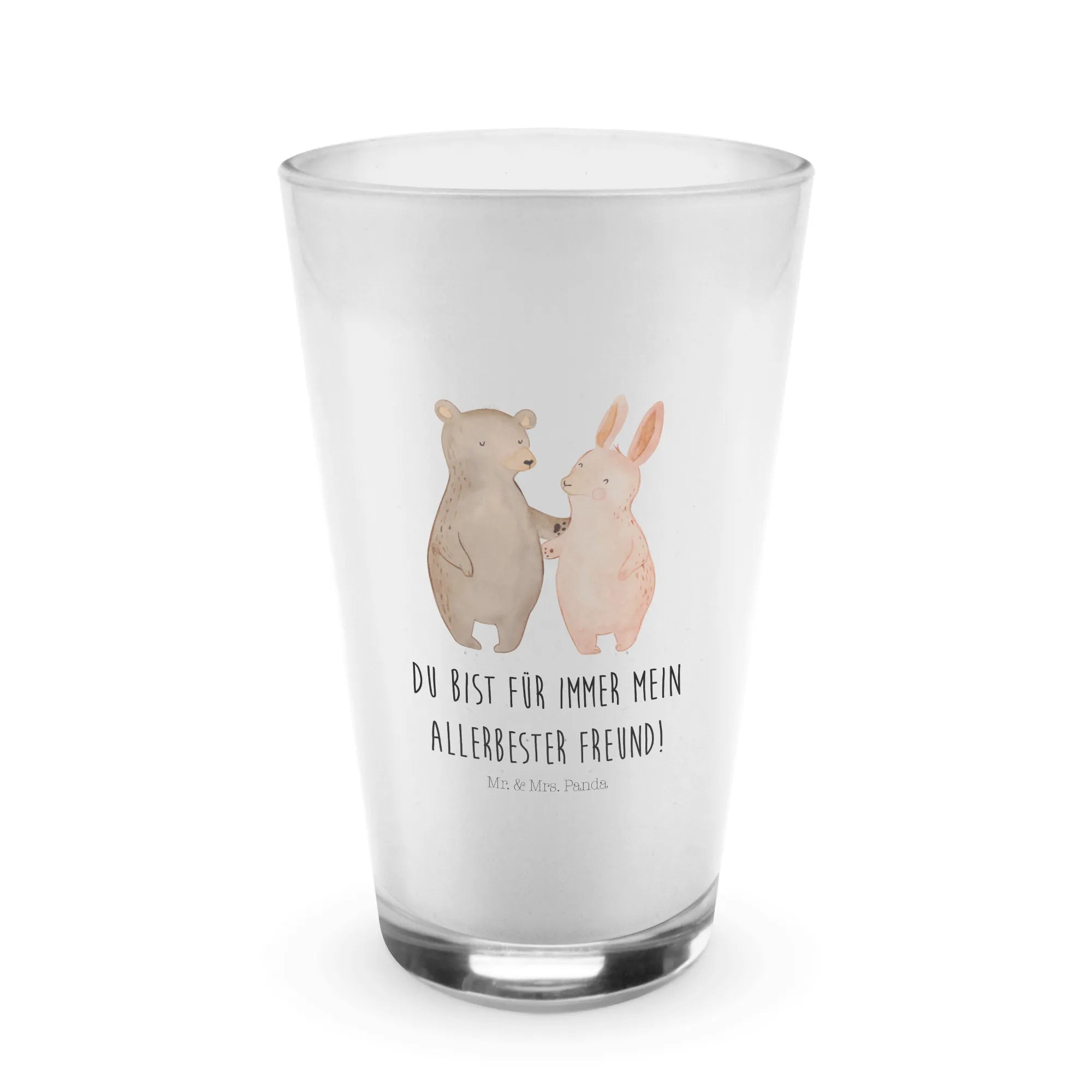 Dieses edle und wunderschöne Glas von Mr. & Mrs. Panda ist der perfekte Begleiter für alle Kaffeeliebhaber und zugleich eine zauberhafte Geschenkidee für besondere Anlässe. Mit seinem niedlichen Motiv, das einen Bären und einen Hasen zeigt, die sich innig umarmen, verbreitet das Glas eine warme und fröhliche Atmosphäre. Der Slogan „Du bist für immer mein allerbester Freund!“ macht es besonders passend für beste Freunde, Partner oder Eheleute.