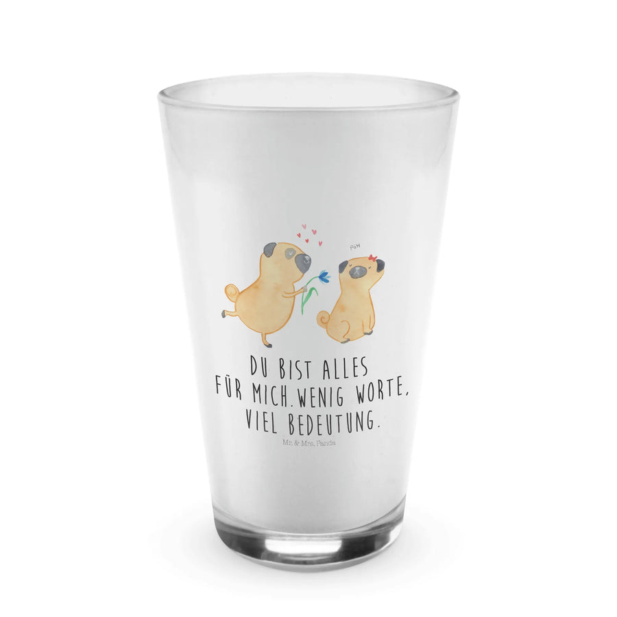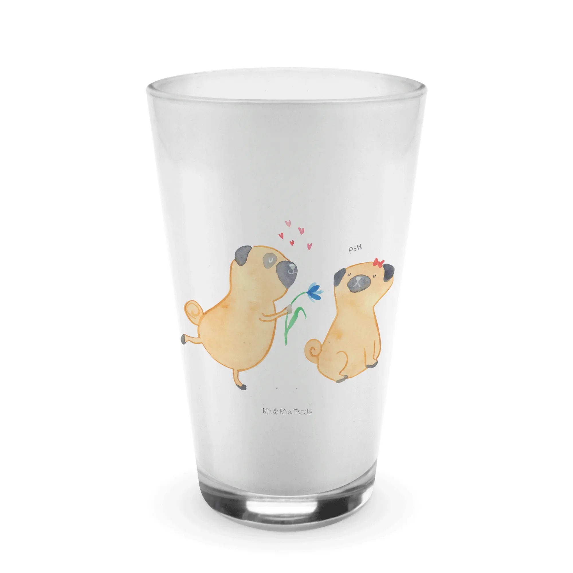 Das Mops verliebt Glas aus der einzigartigen Hunde Kollektion von Mr. & Mrs. Panda ist das perfekte Geschenk für Tierliebhaber und Hundebesitzer. Mit seinem liebevollen Design, das zwei niedliche Möpse zeigt, die verliebt umeinander stehen, bringt es sofort Freude in jedes Zuhause. Dieses hochwertige Trinkglas ist ideal für deinen Cappuccino, Latte Macchiato oder ganz einfach für deinen Lieblingslongdrink.