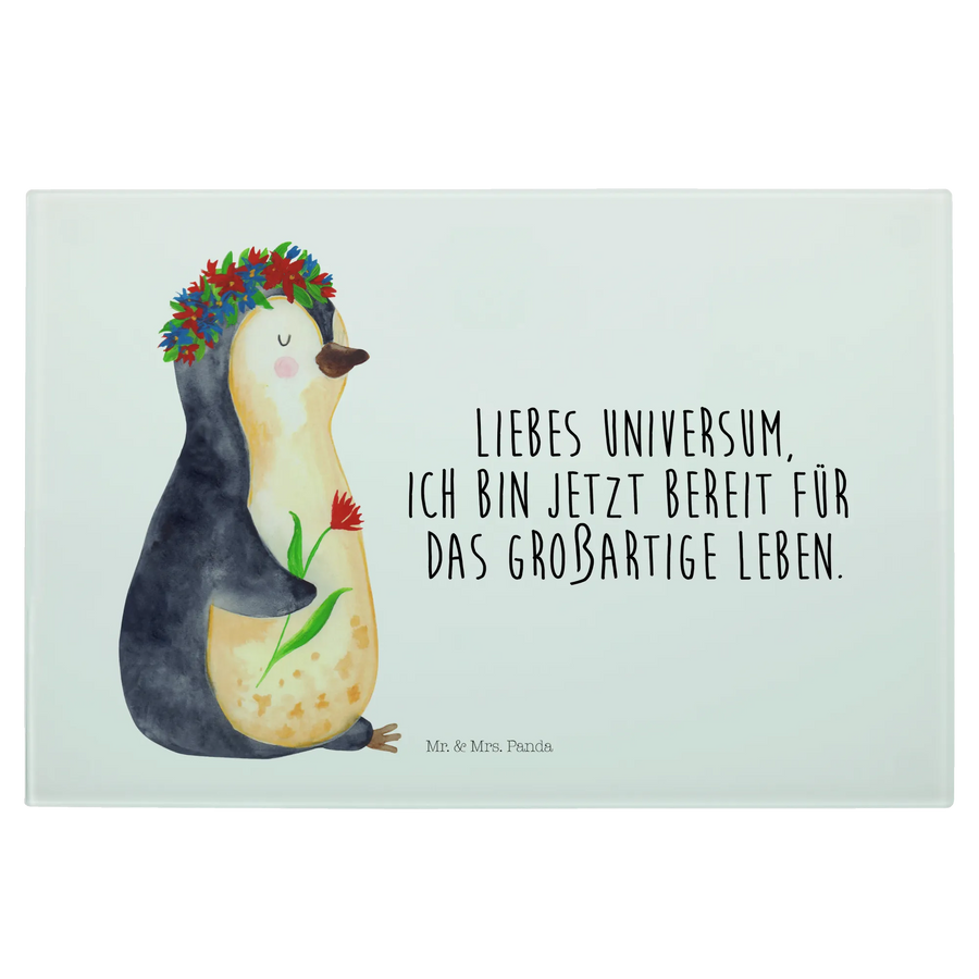 Das Medium Glas Schneidbrett mit dem bezaubernden Pinguin Blumenkranz Motiv von Mr. & Mrs. Panda ist das ideale Geschenk für alle, die das Leben lieben. Ob für Hobbyköche, Pinguin-Liebhaber oder einfach für Menschen, die gerne Zeit in der Küche verbringen – dieses Schneidbrett sorgt nicht nur für Funktionalität, sondern auch für eine Portion Lebensfreude! Mit seinen liebevoll handgezeichneten Motiven und dem charmanten Slogan „Liebes Universum, ich bin jetzt bereit für das großartige Leben“, ist es nicht nur ein praktisches Küchenutensil, sondern auch eine Quelle der Inspiration.