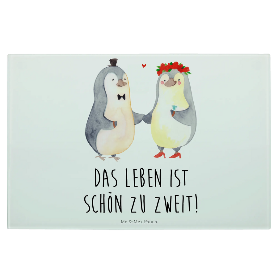 Das perfekte Geschenk für Verliebte und frisch Vermählte – unser XL Glas Schneidbrett mit dem herzerwärmenden Pinguin Heirat-Motiv aus der Liebe Kollektion von Mr. & Mrs. Panda!