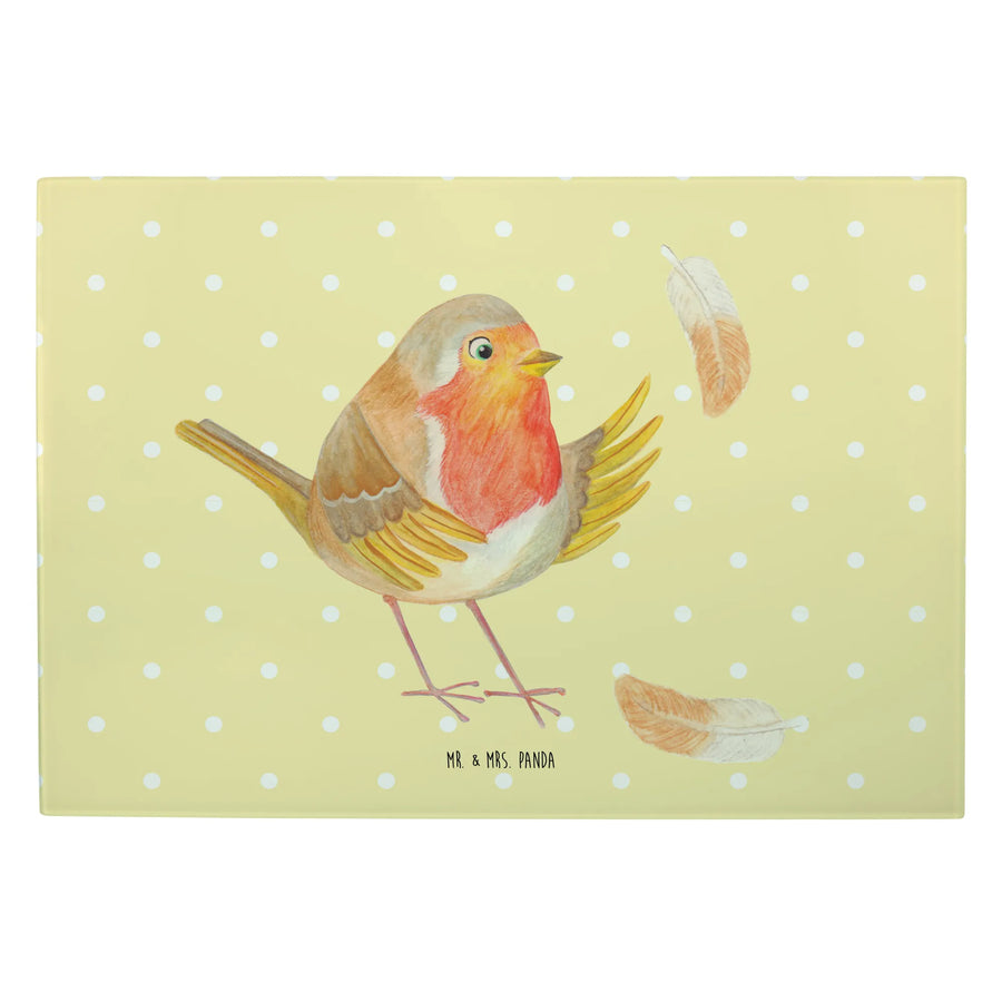 Das XL Glas Schneidbrett mit dem bezaubernden Motiv Rotkehlchen mit Federn von Mr. & Mrs. Panda ist das perfekte Geschenk für jeden, der die Schönheit der Natur und leckeres Essen liebt.