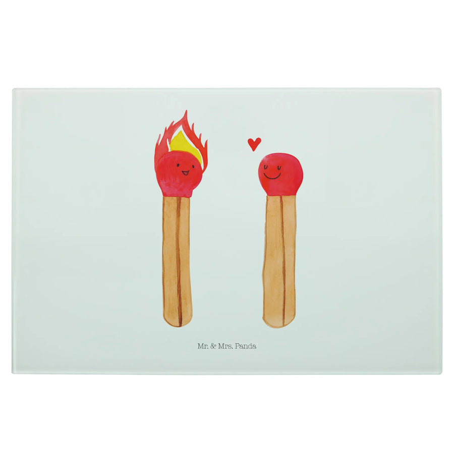 Das XL Glas Schneidbrett mit dem fröhlichen Motiv "Streichhölzer" aus der Liebe Kollektion von Mr. & Mrs. Panda ist das perfekte Geschenk für Verliebte! Dieses einzigartige, kratzfeste Glasbrett eignet sich nicht nur hervorragend als Schneidebrett, sondern zaubert auch ein Lächeln in die Küche. Das Bild zeigt zwei anthropomorphisierte Streichhölzer, die eine liebevolle Verbindung symbolisieren – perfekt für Paare, die ihre Zuneigung zueinander auf besondere Art zeigen möchten.