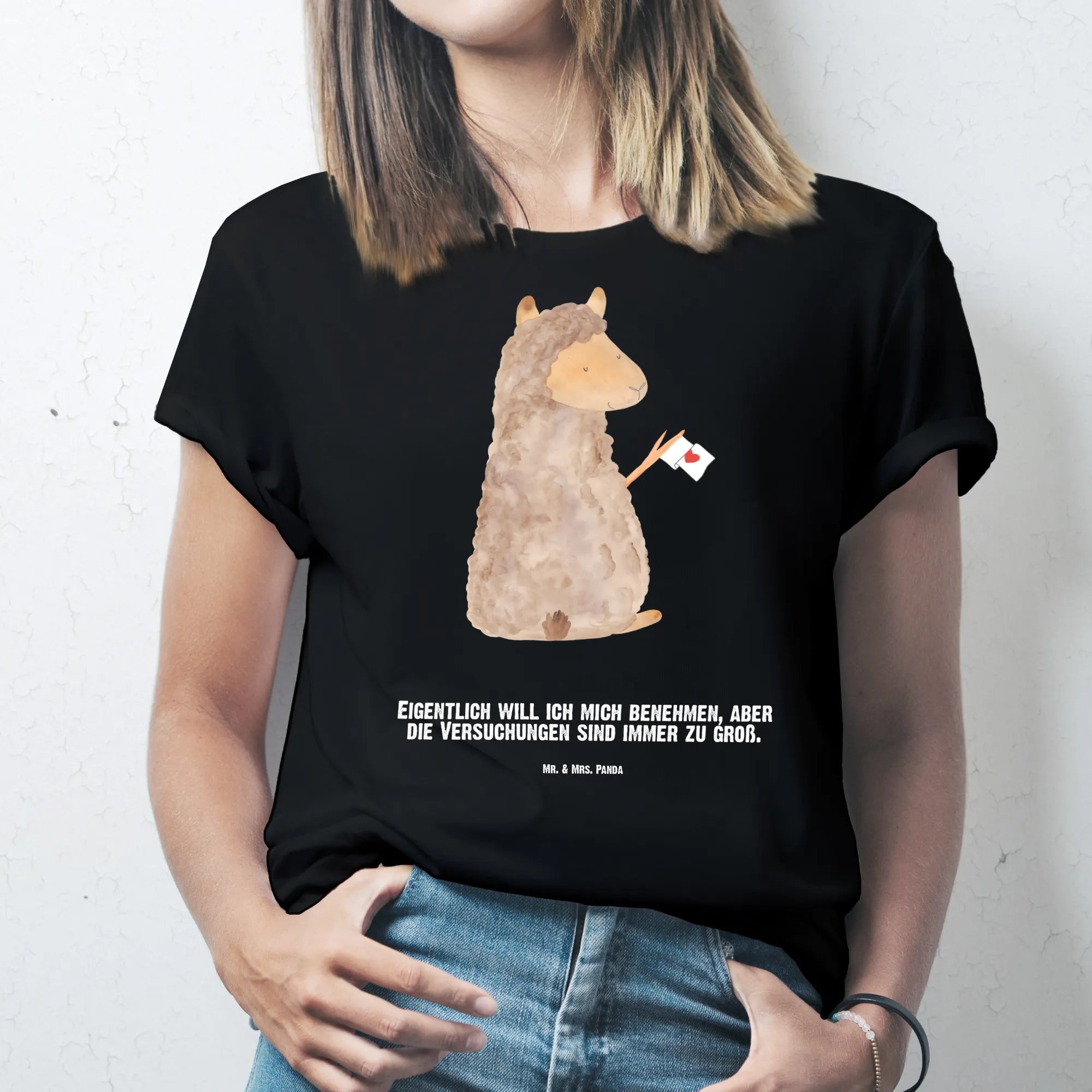 Dieses liebevoll gestaltete T-Shirt aus der Alpaka Kollektion von Mr. & Mrs. Panda vereint Humor, Herz und Persönlichkeit. Das süße Alpaka hält eine Fahne mit Herz, ergänzt durch den frechen Spruch „Eigentlich will ich mich benehmen, aber die Versuchungen sind immer zu groß.“ – ein echtes Statement, das zum Schmunzeln einlädt.