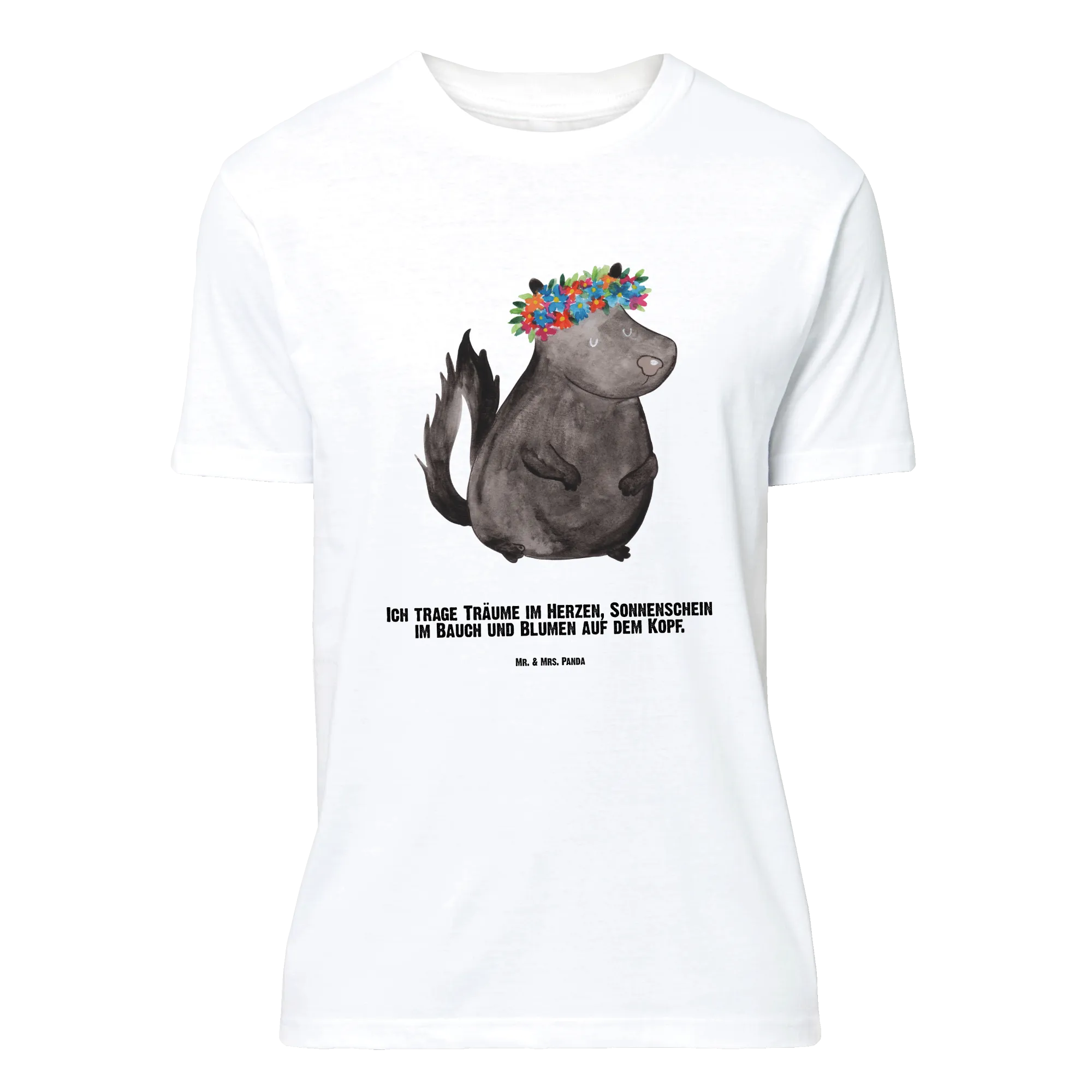 Das niedliche Stinktier mit dem bunten Blumenkranz auf dem Kopf erinnert uns daran, wie wichtig es ist, die kleinen Dinge zu schätzen und die Welt mit einem Lächeln zu betrachten. Ob für einen Geburtstag, ein Jubiläum oder einfach als liebevolle Aufmerksamkeit zwischendurch, dieses T-Shirt ist ein großartiges Geschenk, das Impressionen hinterlässt.