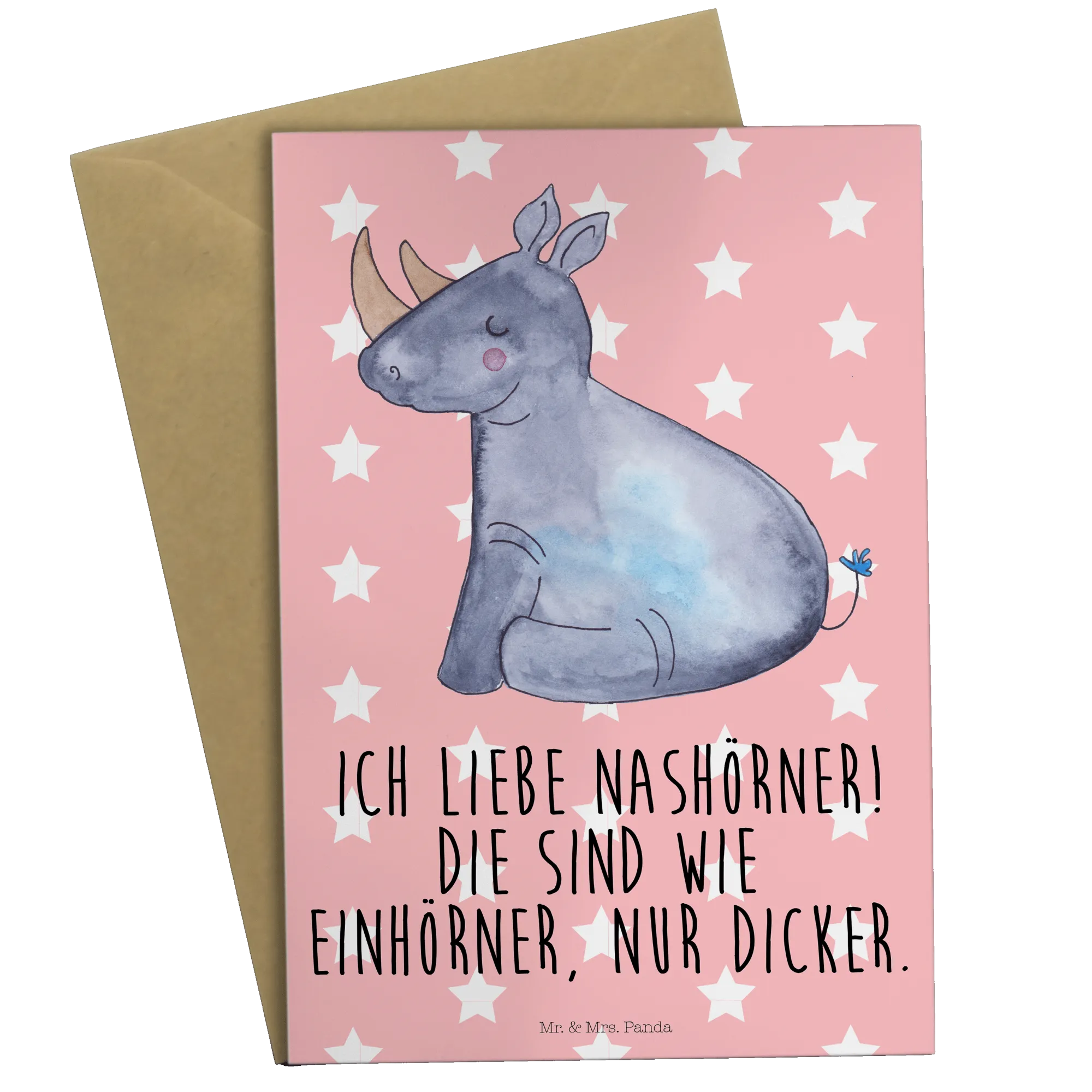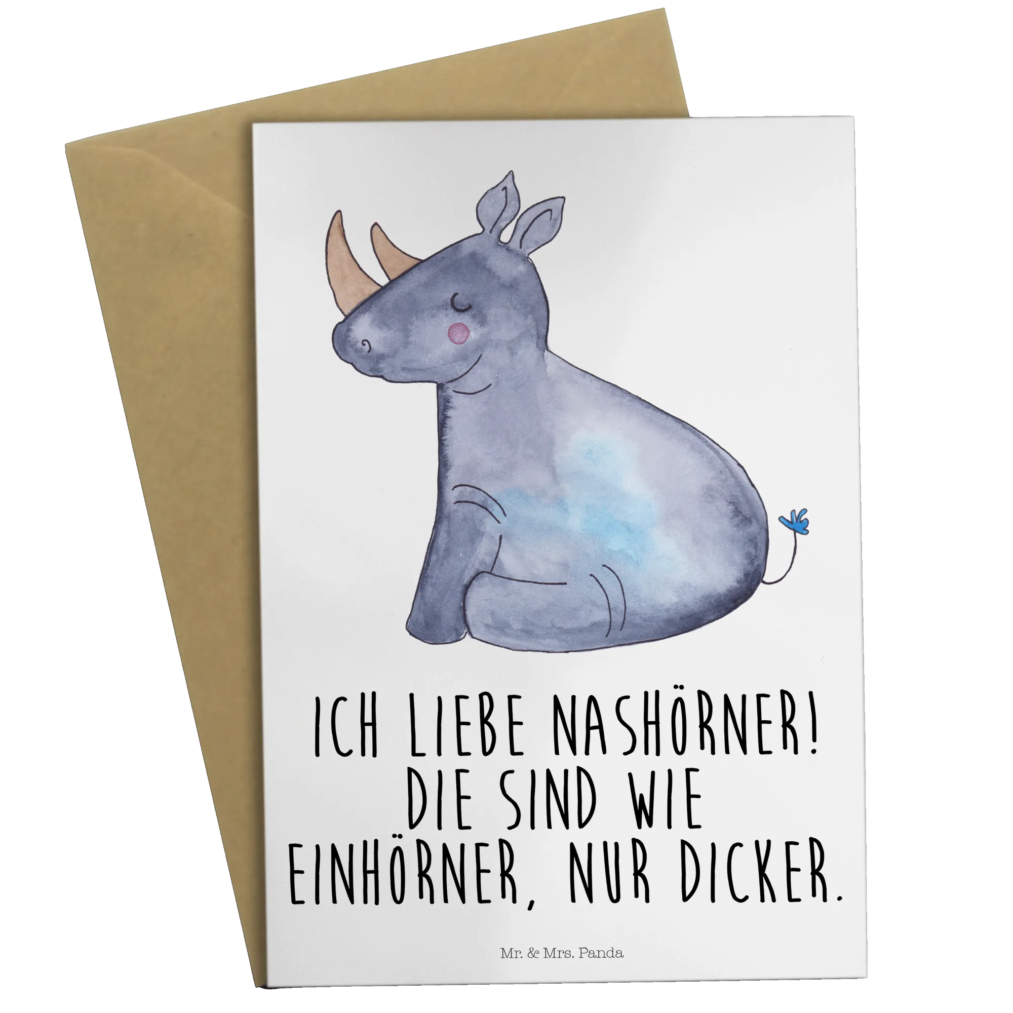 Mit der freundlichen Botschaft 'Ich liebe Nashörner. Die sind wie Einhörner, nur dicker.' bringt diese Karte garantiert ein Schmunzeln auf die Gesichter deiner Freunde und Familie.