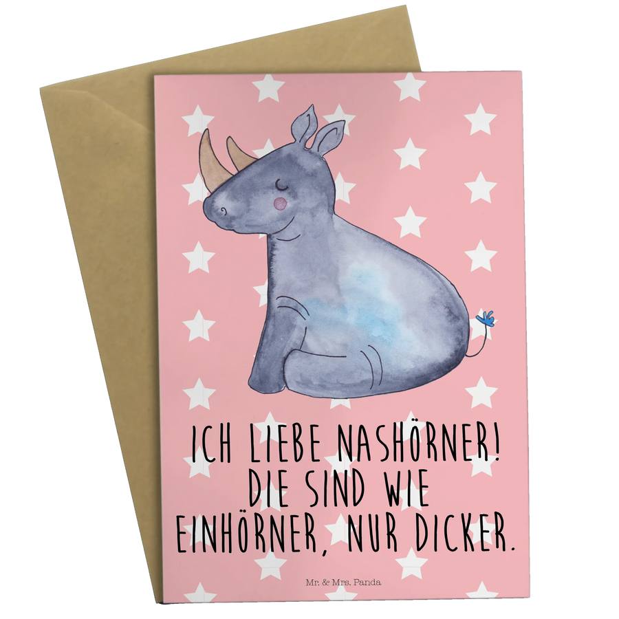 Mit einem charmanten Spruch "Ich liebe Nashörner. Die sind wie Einhörner, nur dicker." bringt diese Karte Freude in jeden Briefkasten. Egal ob für Geburtstagswünsche, Hochzeiten, oder einfach nur, um einem Freund eine Freude zu machen – diese Karte ist vielseitig einsetzbar.