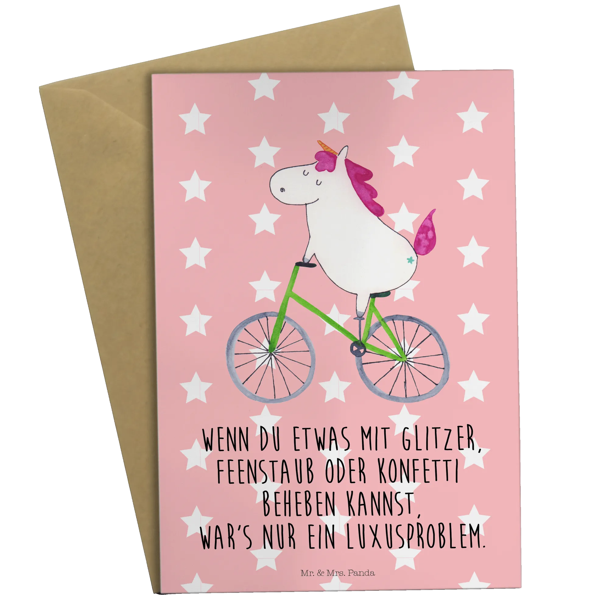 Entdecke unsere bezaubernde Grußkarte mit dem süßen Motiv des Einhorn Radfahrers aus der einzigartigen Einhorn - Kollektion von Mr. & Mrs. Panda!