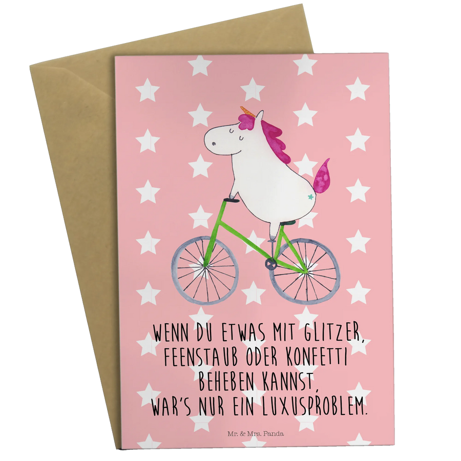 Die Grußkarte mit dem bezaubernden Motiv "Einhorn Radfahrer" aus der Einhorn-Kollektion von Mr. & Mrs. Panda ist das perfekte Geschenk für alle, die Einhörner lieben und ein bisschen Magie in ihren Alltag bringen möchten. Diese wunderschöne und einzigartige Grußkarte, bedruckt mit süßen Motiven, ist ideal für feierliche Anlässe wie Geburtstage, Hochzeiten oder einfach nur, um einem Freund aufzuheitern. Der Spruch "Wenn du etwas mit Glitzer, Feenstaub oder Konfetti beheben kannst, war's nur ein Luxusproblem" wird garantiert ein Lächeln auf die Gesichter Deiner Liebsten zaubern.