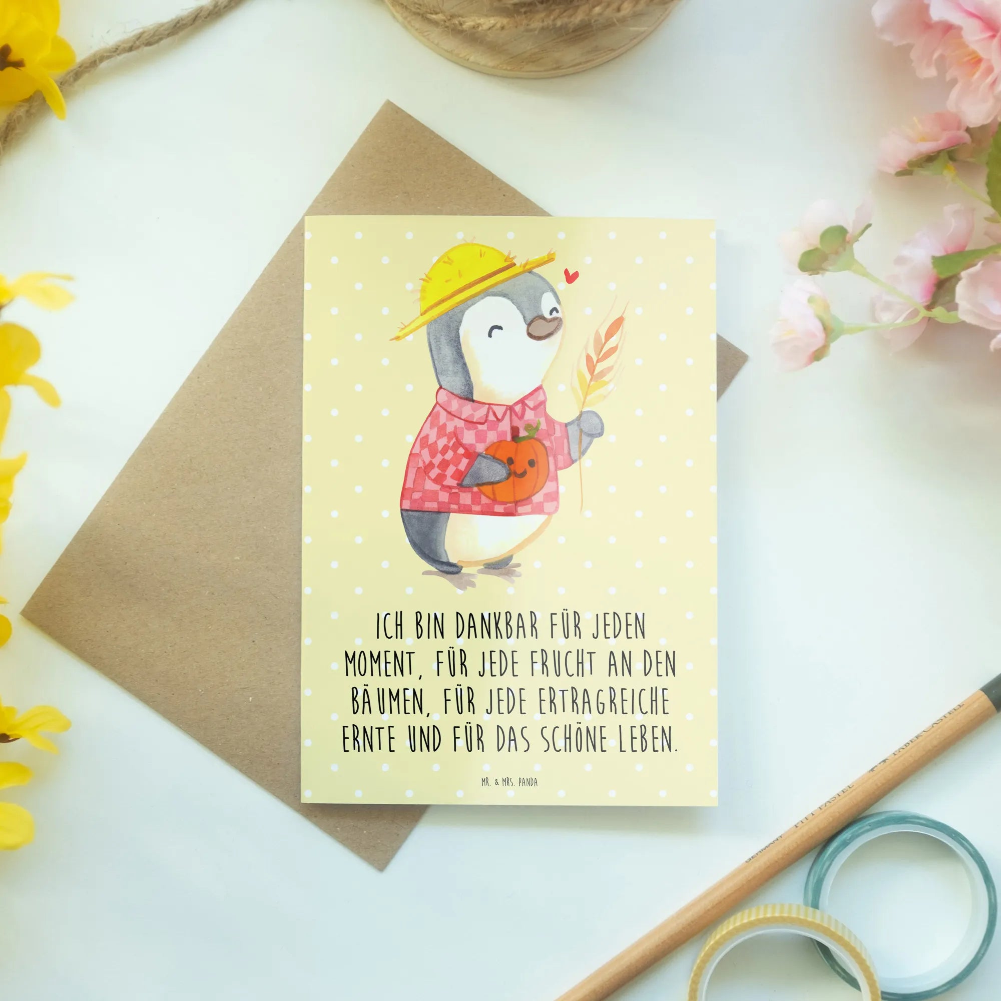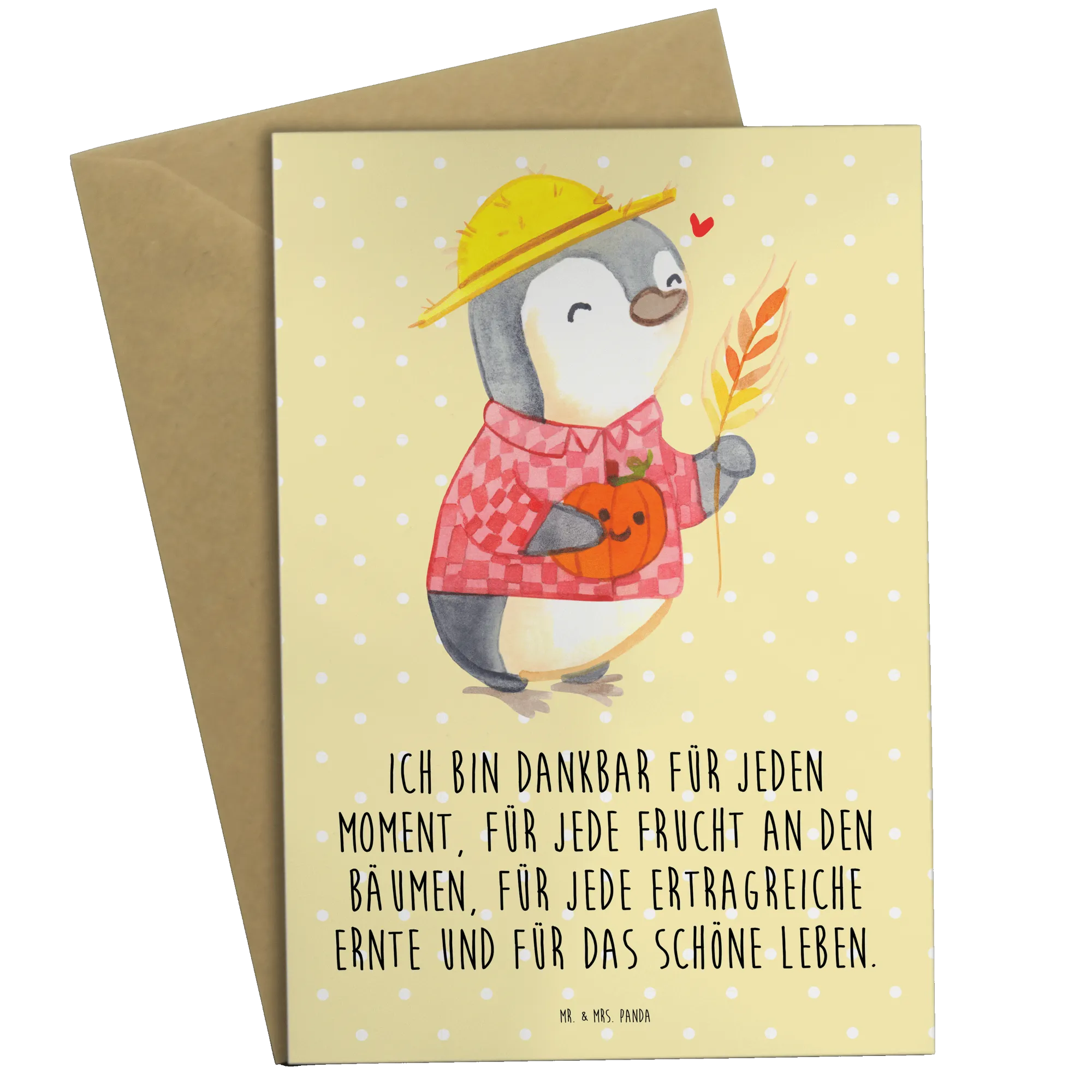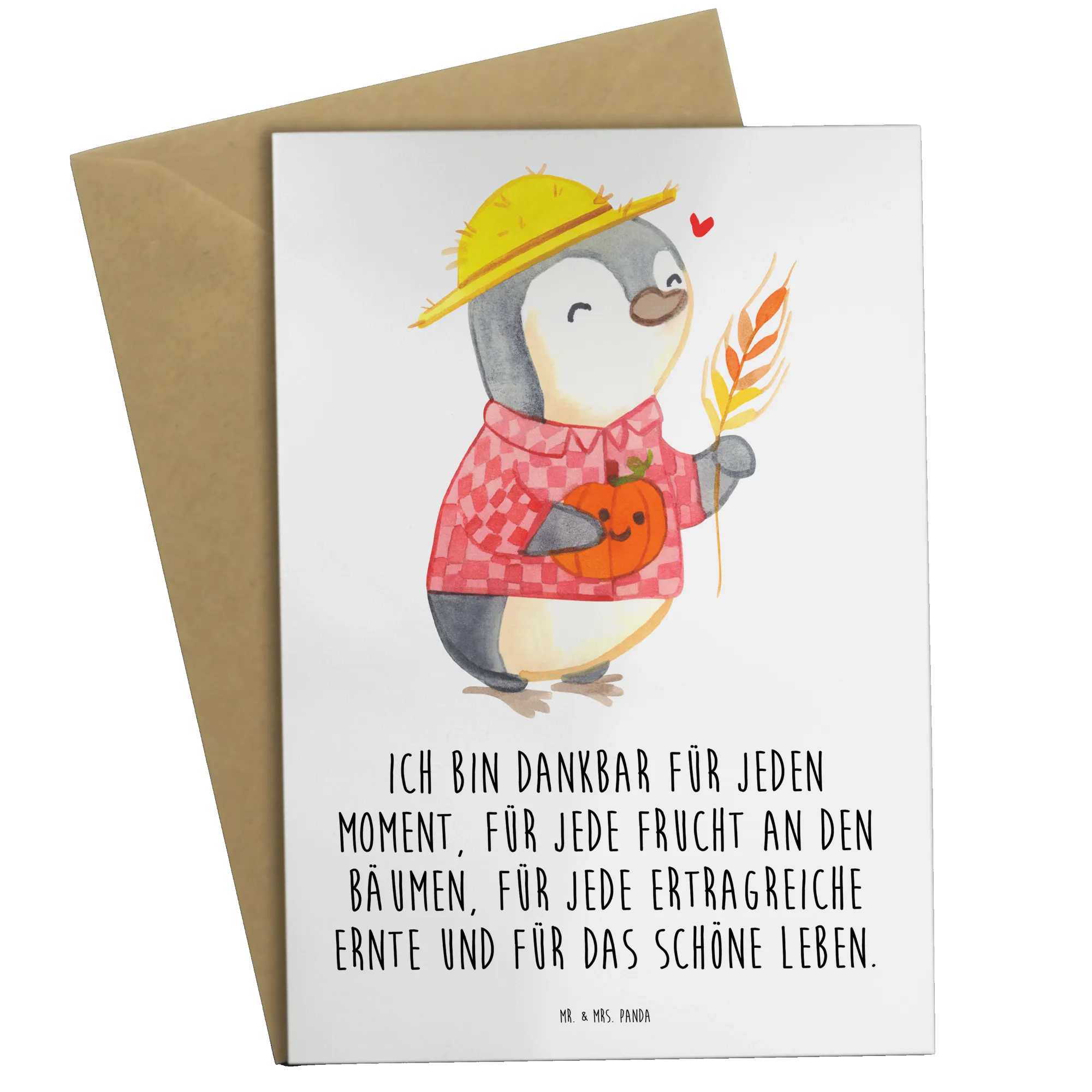 Bist du auf der Suche nach einem besonderen Geschenk für den bevorstehenden Erntedank? Unsere liebevoll gestaltete Grußkarte "Erntedankfest Pinguin" von Mr. & Mrs. Panda ist die ideale Wahl!
