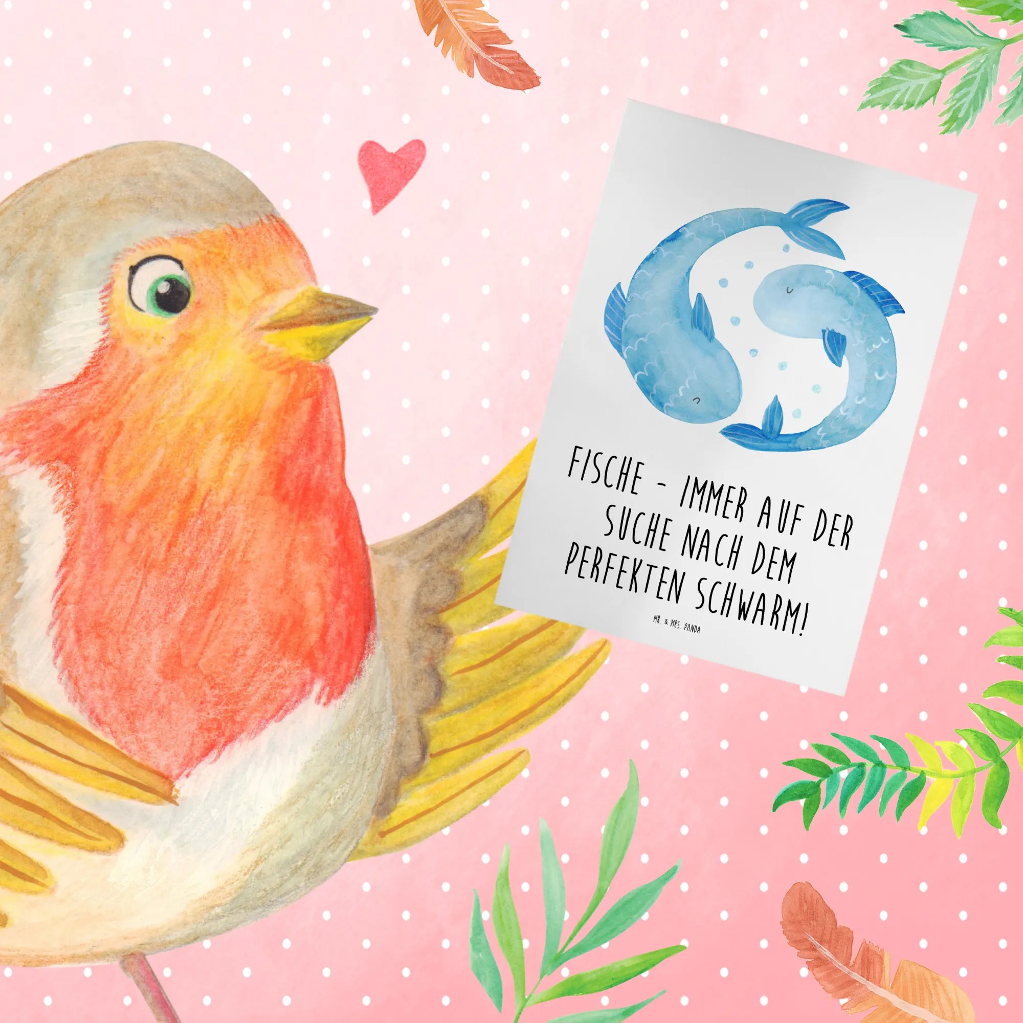 Die wunderschöne Grußkarte "Fische - immer auf der Suche nach dem perfekten Schwarm!" aus der Sternzeichen-Kollektion von Mr. & Mrs. Panda ist das ideale Geschenk für jeden Anlass. Egal ob du einem Freund, einer Freundin oder einem geliebten Menschen eine Freude machen möchtest, diese Karte ist perfekt geeignet, um deine Glückwünsche elegant zu übermitteln. Ob zum Geburtstag, zu einer Hochzeit oder einfach nur so, sie bringt ein Lächeln auf jedes Gesicht. Das niedliche Motiv der Fische, liebevoll von Mrs. Panda handgezeichnet, bringt die Eigenschaften des Sternzeichens perfekt zur Geltung und sorgt für einen ganz besonderen Charme.