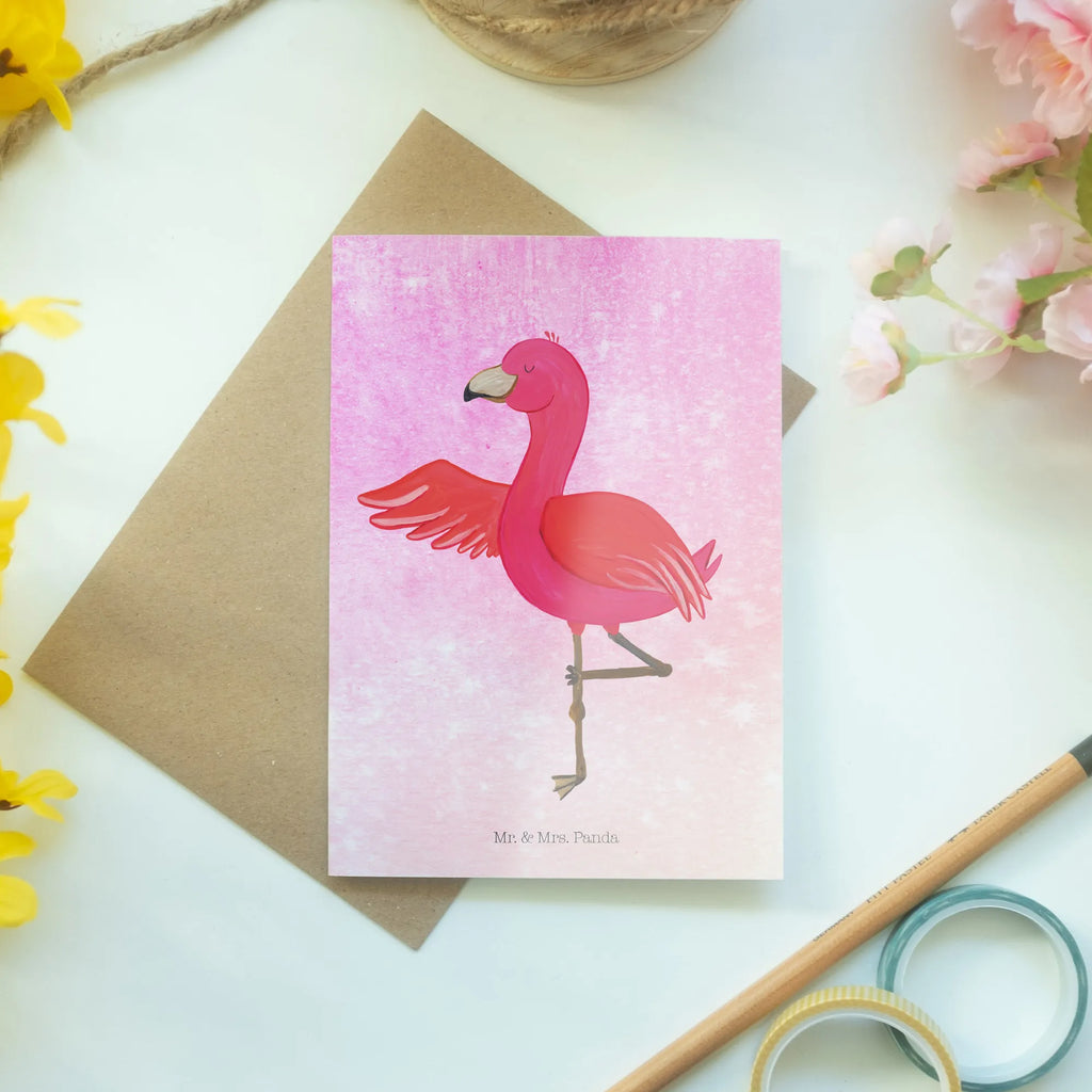 Die Grußkarte Flamingo Yoga aus unserer zauberhaften Flamingo-Kollektion von Mr. & Mrs. Panda ist das ideale Geschenk für alle, die Leidenschaft für Achtsamkeit und Entspannung in ihr Leben bringen möchten. Diese wunderschöne und einzigartige Grußkarte mit einem handgezeichneten, lebhaften pinken Flamingo in einer eleganten Yoga-Pose spricht nicht nur die Yogis unter dir an, sondern auch jeden, der einen Moment der Ruhe und Gelassenheit sucht. Der helle und freundliche Flamingo steht auf einem Bein und vermittelt mit seiner offenen Flügelhaltung einen Eindruck von Freiheit und Entspannung, genau das, was wir in unserem hektischen Alltag brauchen!