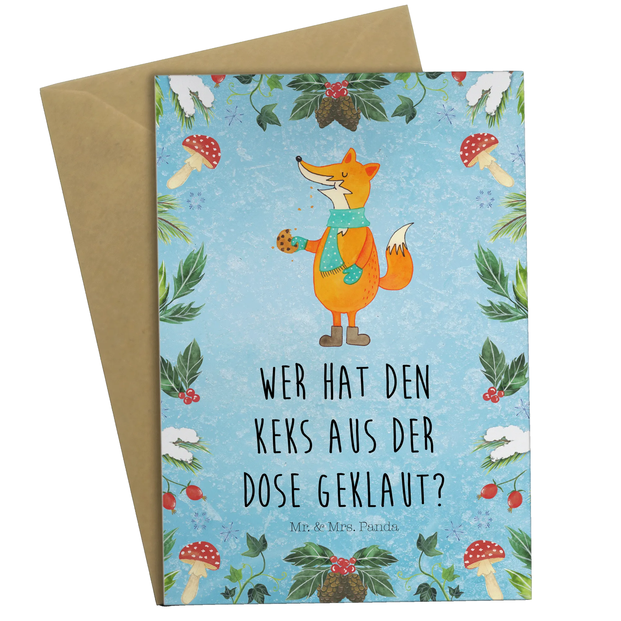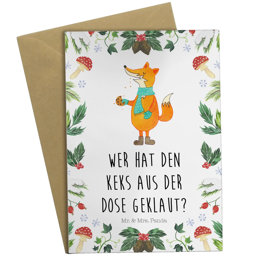 Ob zur Weihnachtsdeko, als schönes Element auf dem Tisch oder einfach als liebevolle Aufmerksamkeit – die Grußkarte Fuchs Keksdose wird zum Hingucker und sorgt für gute Laune. Verschenke Freude und Wärme in der kalten Jahreszeit mit dieser liebevoll gestalteten Grußkarte von Mr. & Mrs. Panda.