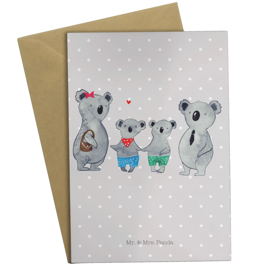 Das liebevoll gestaltete Motiv zeigt eine charmante Koalafamilie: Die Mutter mit einem roten Sternchen im Haar und einer braunen Tasche, der fröhliche Koalamann im Anzug mit einer Krawatte, sowie die beiden süßen Koala-Kinder in bunten Shorts. Eine perfekte Darstellung der besten Familie der Welt, die einfach jeden in ihren Bann zieht. Diese Karte ist mehr als nur ein Stück Papier – sie ist ein Ausdruck von Familienliebe und gemeinsamen Momenten.