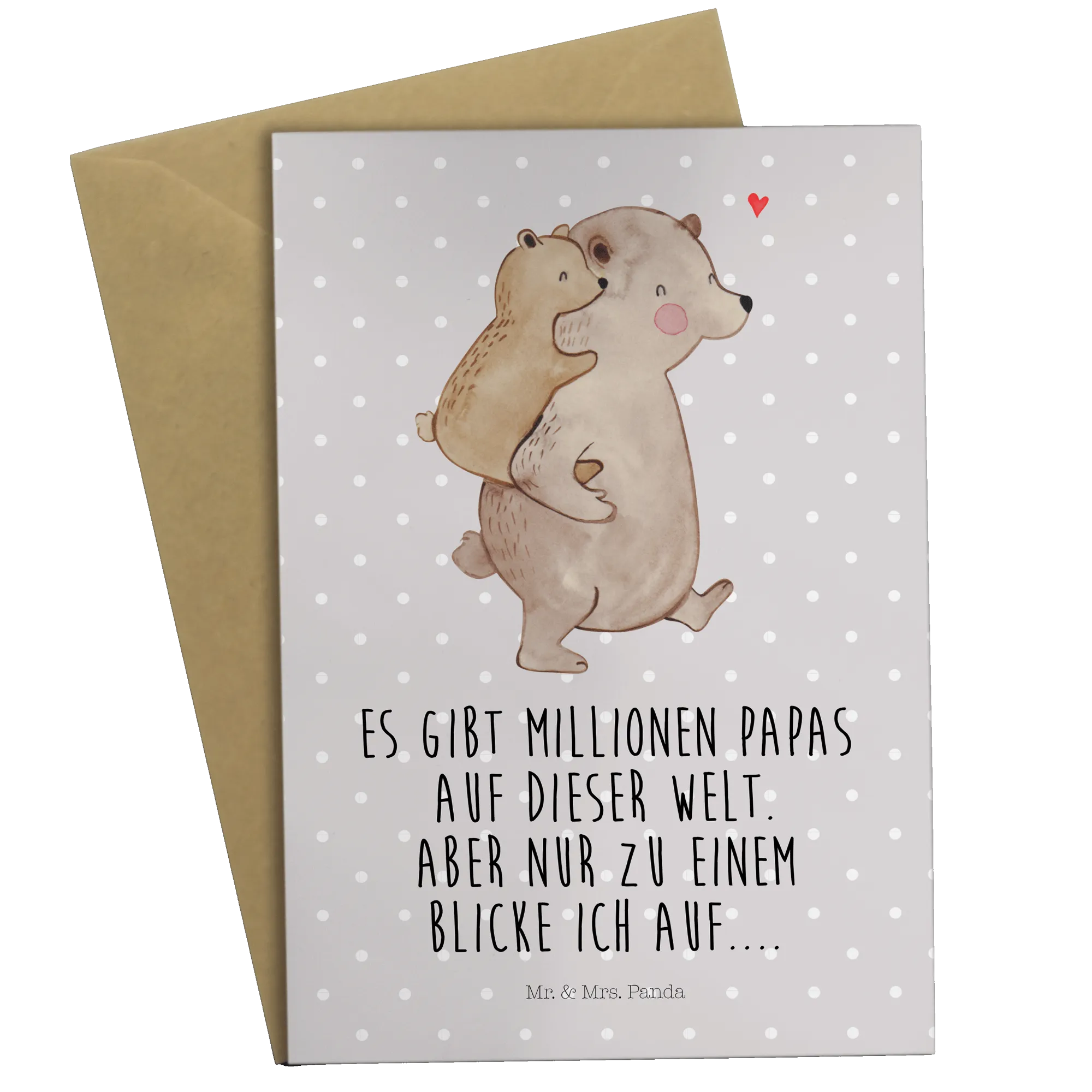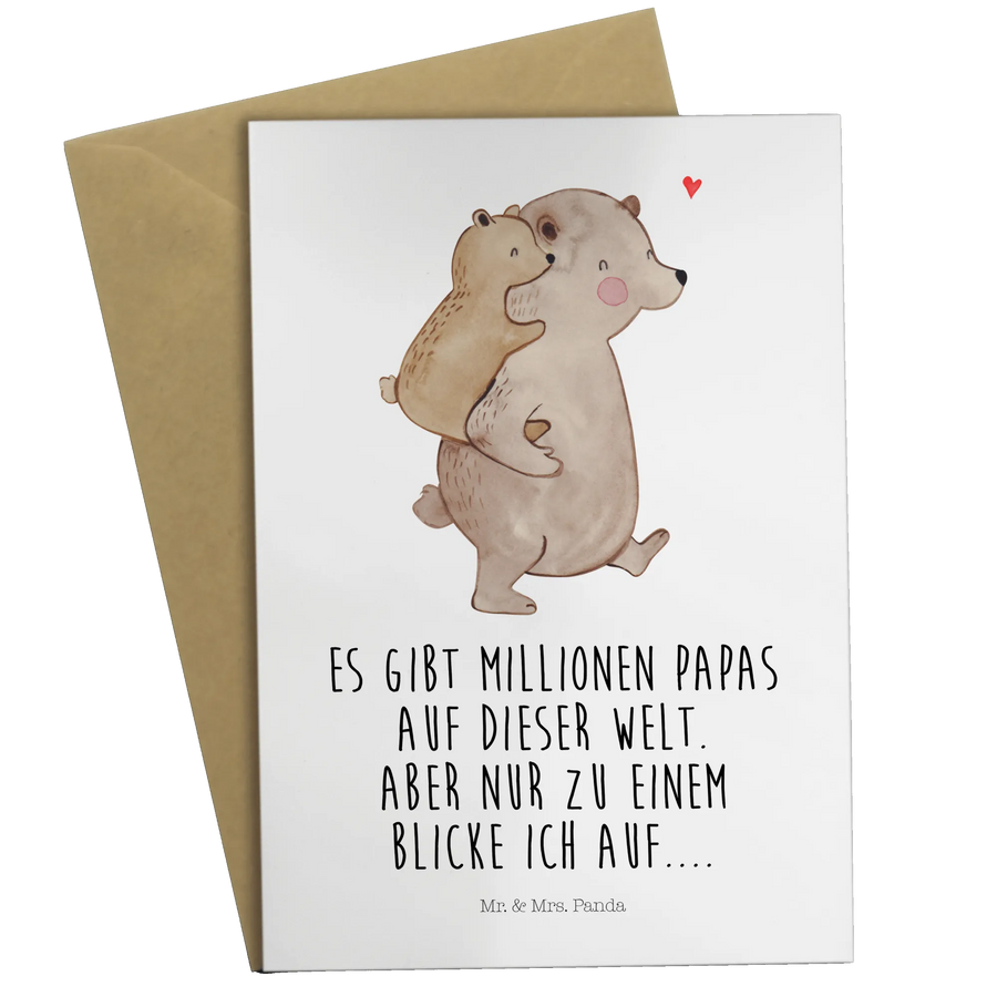 Die Grußkarte „Papa Bär" aus der Familien Kollektion von Mr. & Mrs. Panda ist ein kleines Kunstwerk für große Gefühle. Auf der Vorderseite trägt ein großer Bär einen kleineren Bären auf dem Rücken – eine Szene voller Geborgenheit, Nähe und Vertrauen. Der Spruch „Es gibt Millionen Papas auf dieser Welt. Aber nur zu einem blicke ich auf...." macht die Karte zur idealen Vatertagskarte oder Geburtstagskarte für Papa, Papi, Vater oder Onkel.