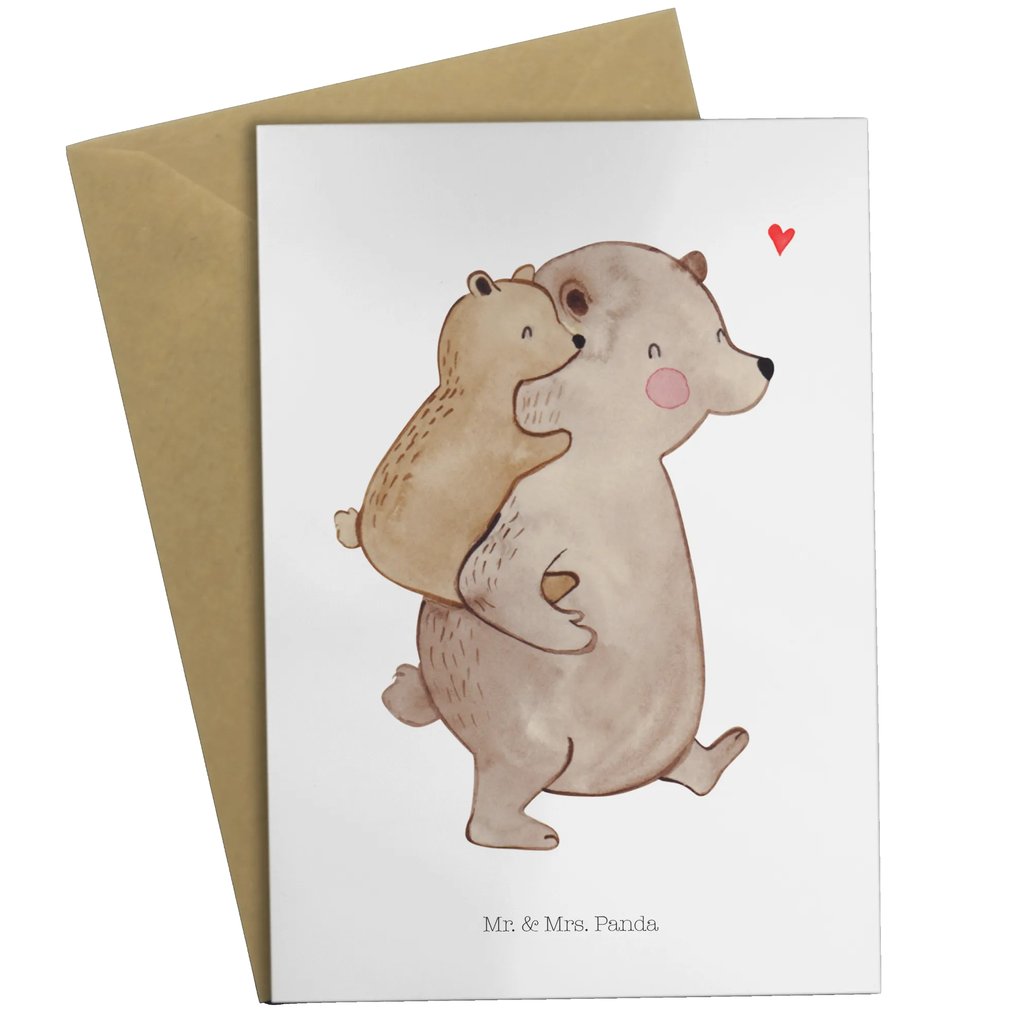 Diese liebevoll gestaltete Grußkarte ziert ein fröhliches Motiv, das zwei Bären zeigt, die eine ganz besondere Verbindung haben: Ein großer Bär, der einen kleineren auf seinem Rücken trägt, vermittelt Wärme, Geborgenheit und das Gefühl von Familie.