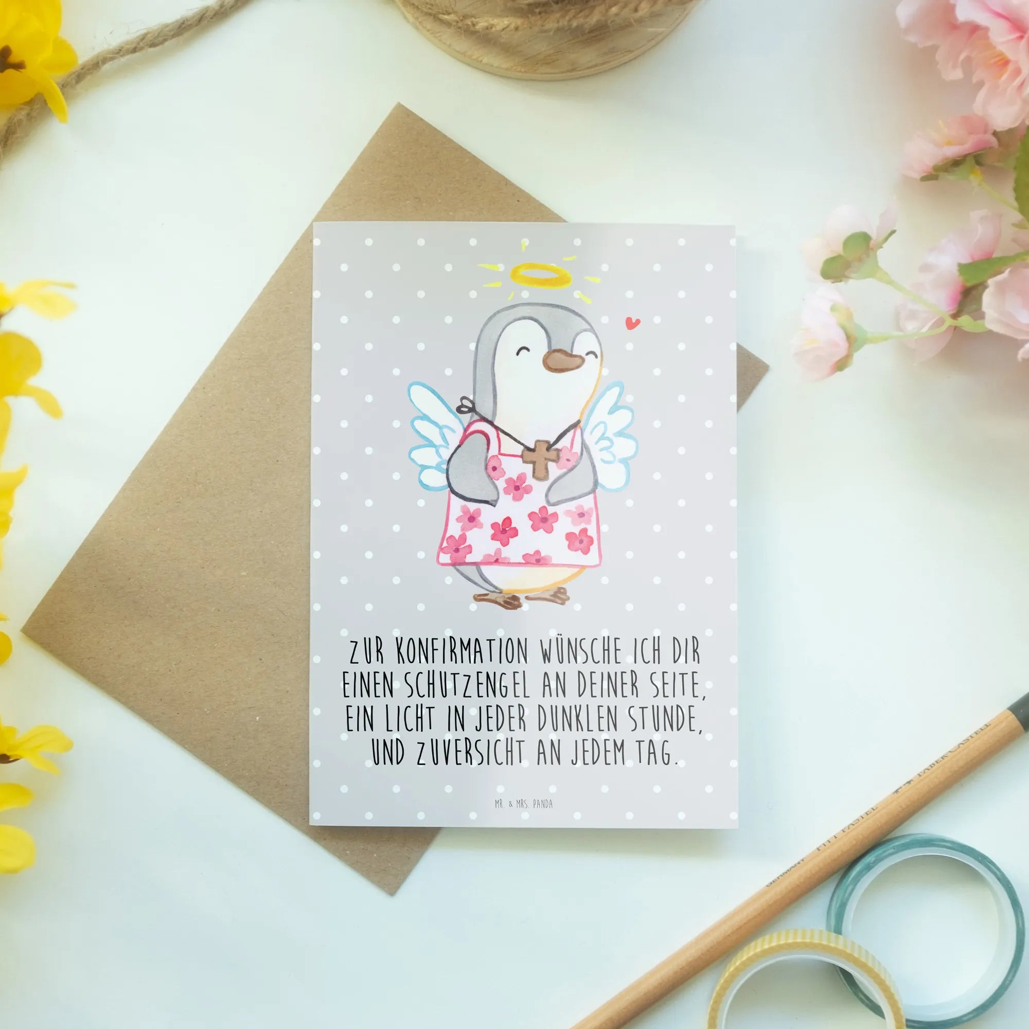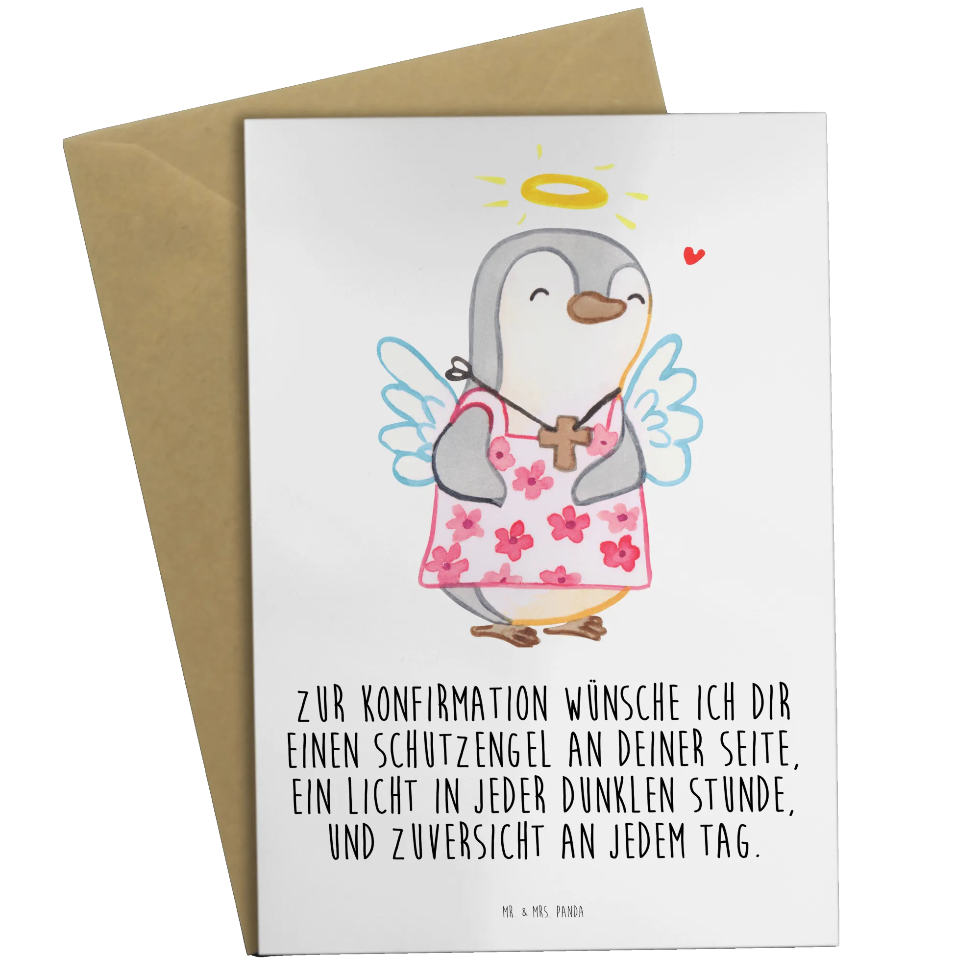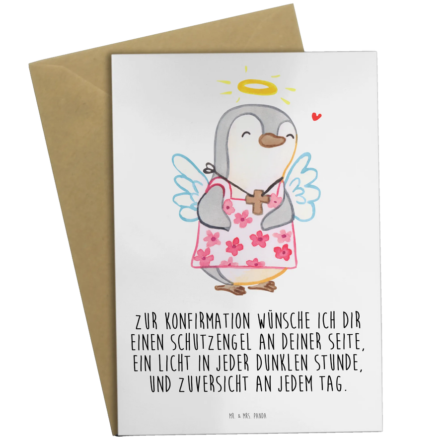 Mr. & Mrs. Panda Grußkarte „Pinguin Konfirmation“ – eine liebevolle Karte voller Zuversicht und Schutzengel-Magie. Der süße Pinguin im Blumenkleid trägt eine kleine Kreuz-Halskette und einen Heiligenschein. Auf der Vorderseite steht der herzliche Spruch: „Zur Konfirmation wünsche ich dir einen Schutzengel an deiner Seite, ein Licht in jeder dunklen Stunde, und Zuversicht an jedem Tag.“