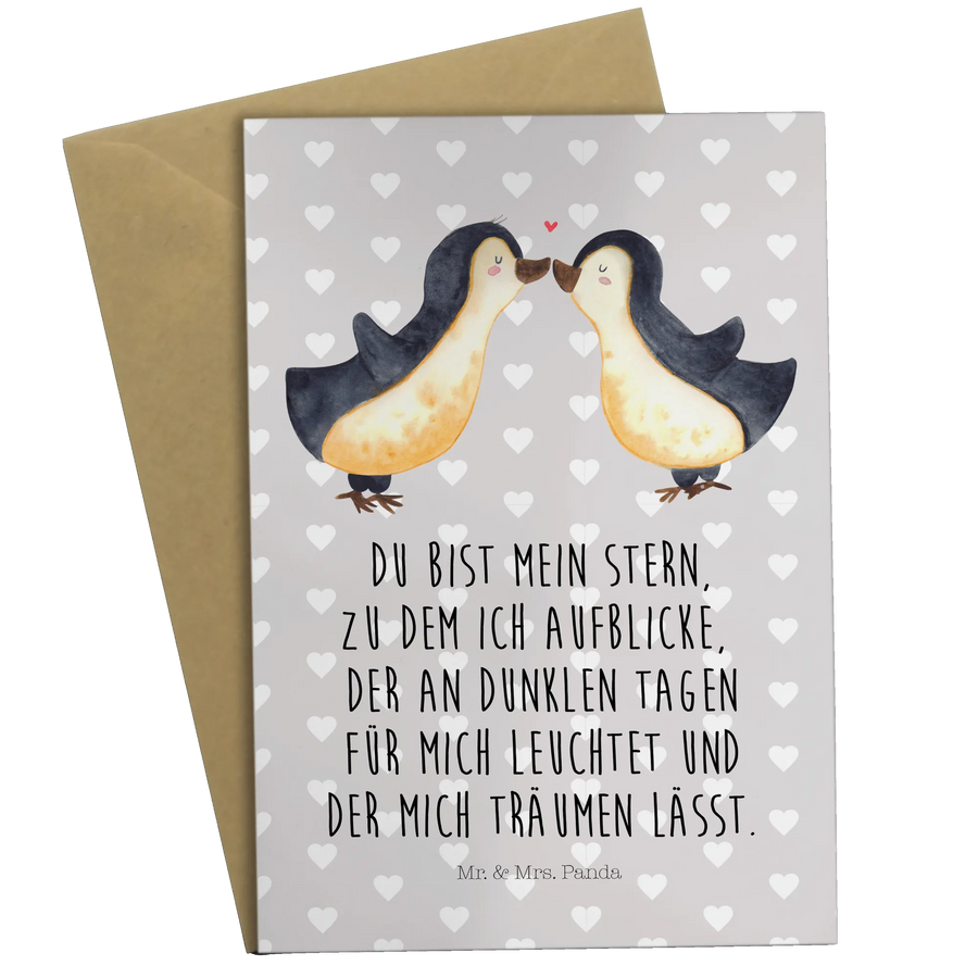 Die Grußkarte "Pinguin Liebe" von Mr. & Mrs. Panda ist das perfekte Geschenk für alle Verliebten. Diese wunderschöne und einzigartige Klappkarte begeistert durch ihr zauberhaftes Motiv: zwei süße Pinguine, die sich aneinander kuscheln und sich mit geschlossenen Augen sanft an den Schnäbeln berühren. Ein kleines Herz schwebt über den beiden und symbolisiert ihre bedingungslose Liebe. Auf der Vorderseite prangt der liebevolle Spruch: „Du bist mein Stern, zu dem ich aufblicke, der an dunklen Tagen für mich leuchtet und der mich träumen lässt.“ Diese Karten sind ideal, um deine Liebe auszudrücken und besondere Anlässe wie Jahrestage, Verlobungen oder Hochzeiten gebührend zu feiern.