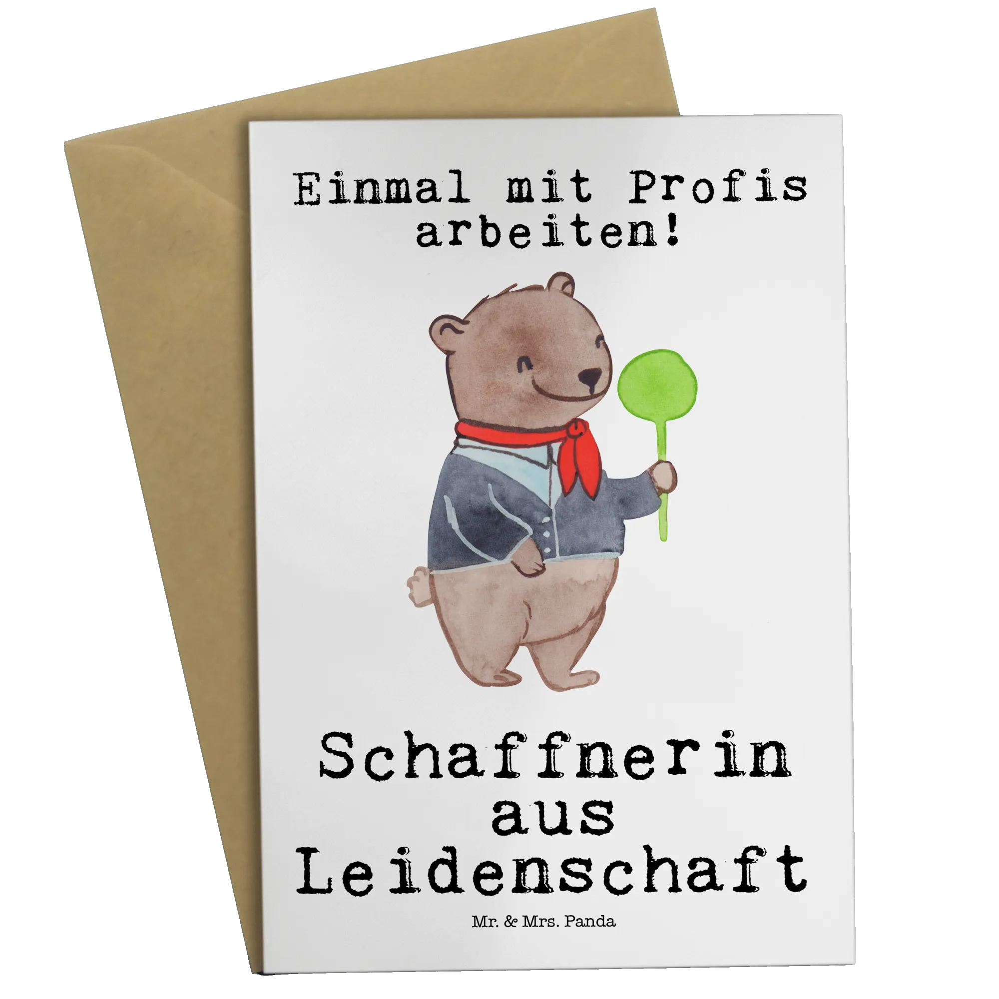 Die Grußkarte "Schaffnerin aus Leidenschaft" von Mr. & Mrs. Panda ist das perfekte Geschenk für all diejenigen, die im Bahnverkehr tätig sind oder eine große Leidenschaft für die Eisenbahn haben. Diese liebevoll gestaltete Karte aus hochwertigem Karton (300 Gramm) zeigt einen niedlichen Bären in Schaffneruniform und trägt den Slogan "Schaffnerin aus Leidenschaft". Sie eignet sich hervorragend für Anlässe wie Abschiedsfeiern, Berufsjubiläen oder einfach nur, um seinen Kollegen oder Freunden zu zeigen, dass man an sie denkt.