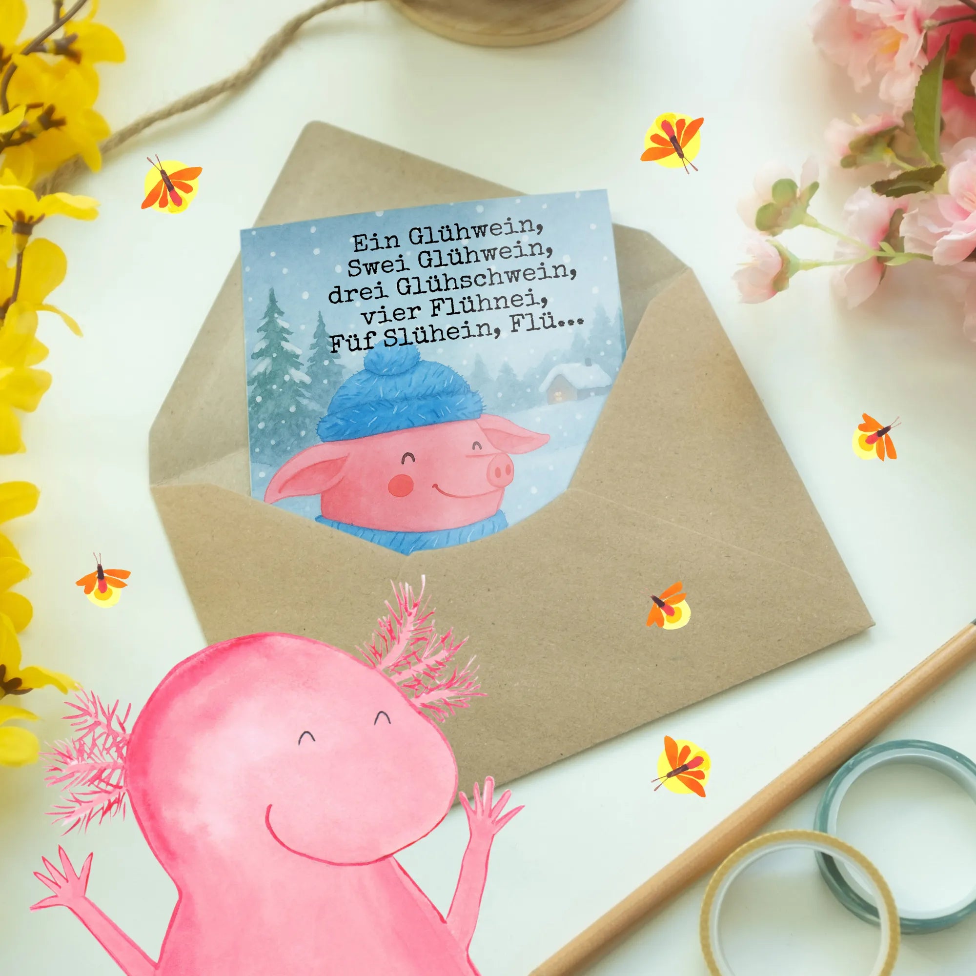 Klappkarte Schweinchen Glühwein Design - mit Spruch