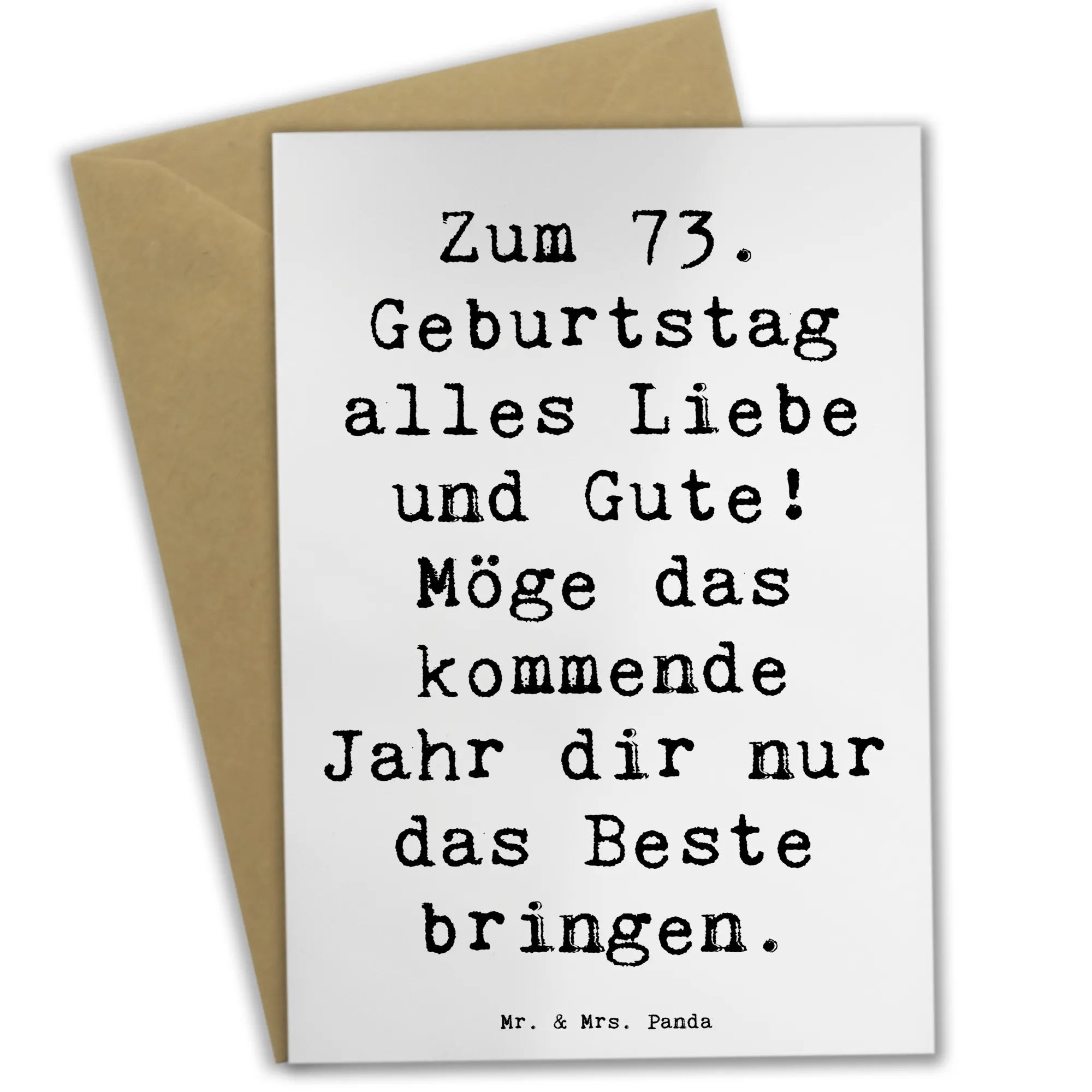 Die wunderschöne Grußkarte von Mr. & Mrs. Panda zum 73. Geburtstag ist das perfekte Geschenk für all jene, die einen ganz besonderen Tag feiern möchten. Mit dem liebevollen Spruch "Zum 73. Geburtstag alles Liebe und Gute! Möge das kommende Jahr dir nur das Beste bringen." zaubert diese Karte jedem Geburtstagskind ein Lächeln ins Gesicht. Diese Karte gehört zur einzigartigen Kollektion "Geburtstag Alter", die speziell für runde und besondere Geburtstage gestaltet wurde.