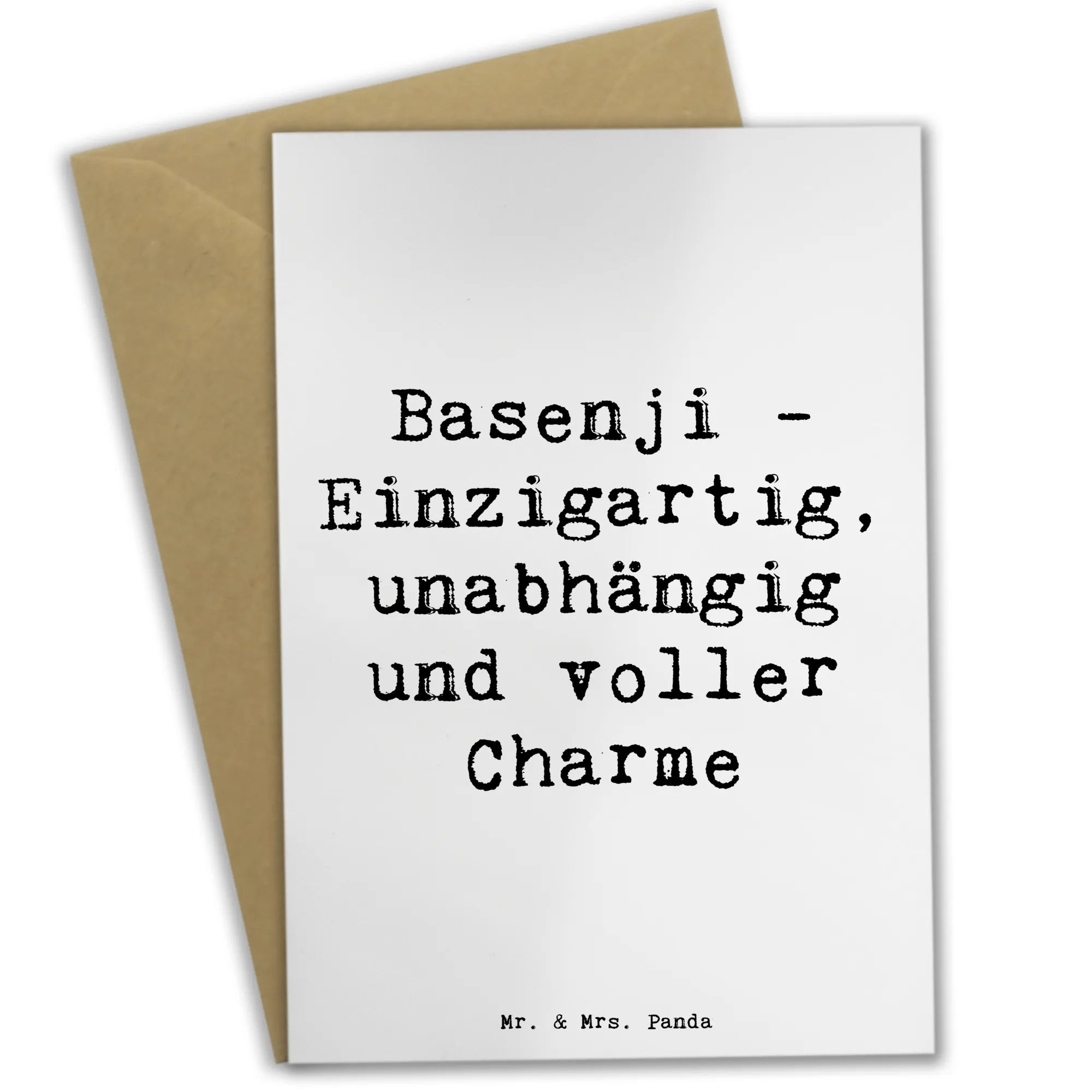 Die Grußkarte mit dem einzigartigen Basenji-Motiv aus der Hunderassen-Kollektion von Mr. & Mrs. Panda ist das perfekte Geschenk für Hundefans und Tierliebhaber! Diese Karte bringt nicht nur Freude, sondern auch eine herzliche Botschaft mit sich. Der Spruch "Basenji - Einzigartig, unabhängig und voller Charme" ziert die Vorderseite der Karte und lädt zum Schmunzeln ein.