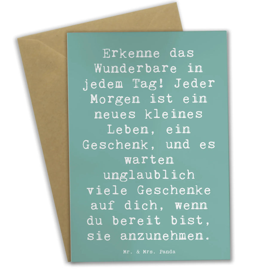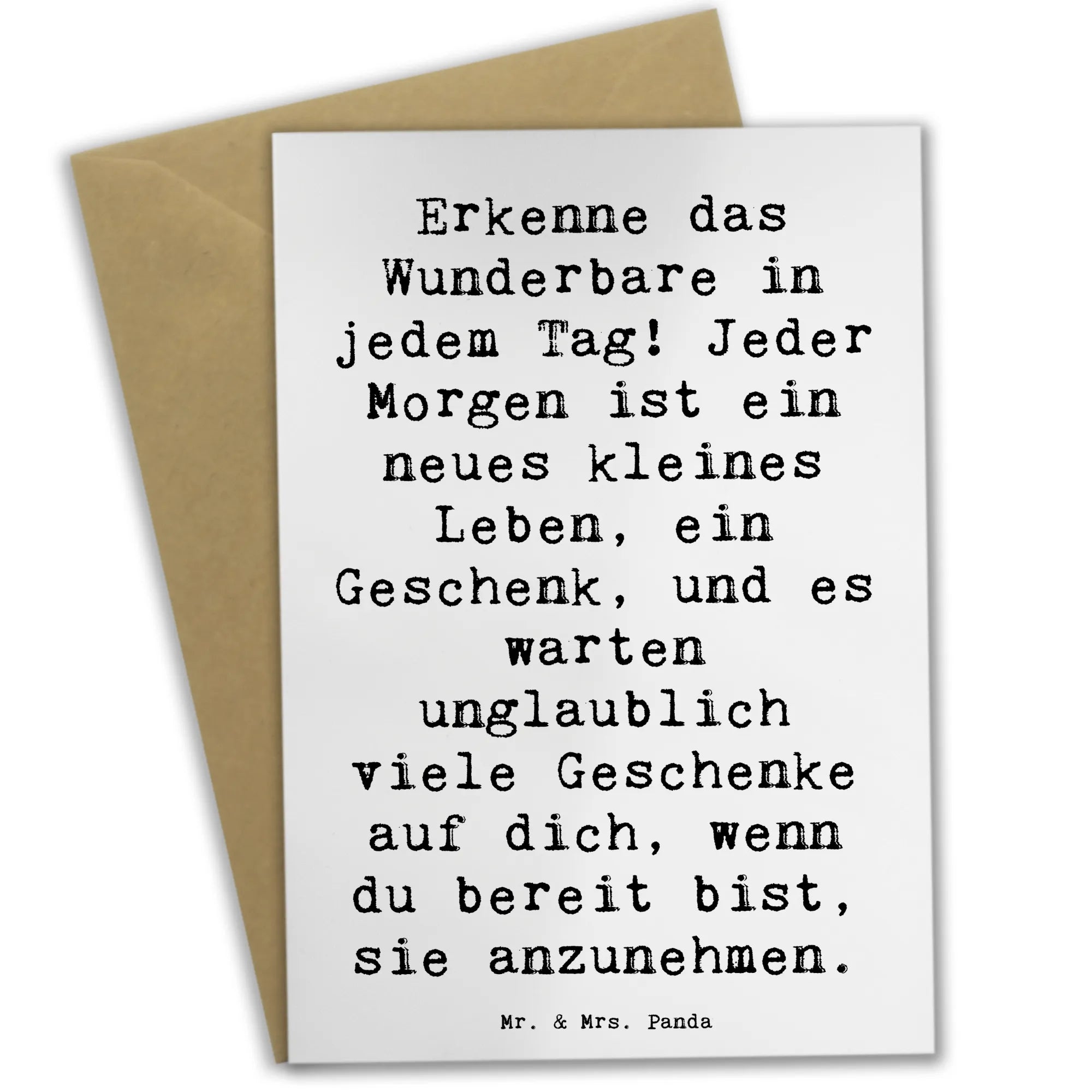 Der Spruch "Erkenne das Wunderbare in jedem Tag! Jeder Morgen ist ein neues kleines Leben, ein Geschenk, und es warten unglaublich viele Geschenke auf dich, wenn du bereit bist, sie anzunehmen." lädt dazu ein, das Leben mit offenen Augen zu betrachten und die kleinen Wunder um uns herum zu genießen. Mit dieser Botschaft bringst du nicht nur Freude, sondern auch Motivation und Inspiration zu demjenigen, der die Karte erhält.
